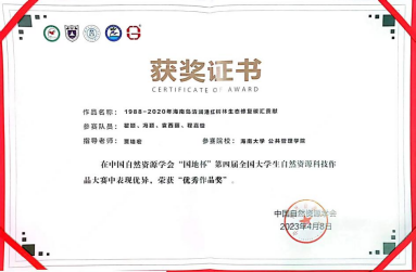 2023年4月8日,“国地杯”第四届全国大学生自然资源科技作品大赛在内蒙古呼和浩特顺利落下帷幕。我院由土地资源管理专业2020级本科生瞿颖、袁西丽、程嘉璇同学及2019级冯颖同学组成的“红树林碳汇先锋队”在贾培宏教授的指导下完成的作品《1988-2020年海南岛清澜港红树林生态修复碳汇贡献》荣获“优秀作品奖”。