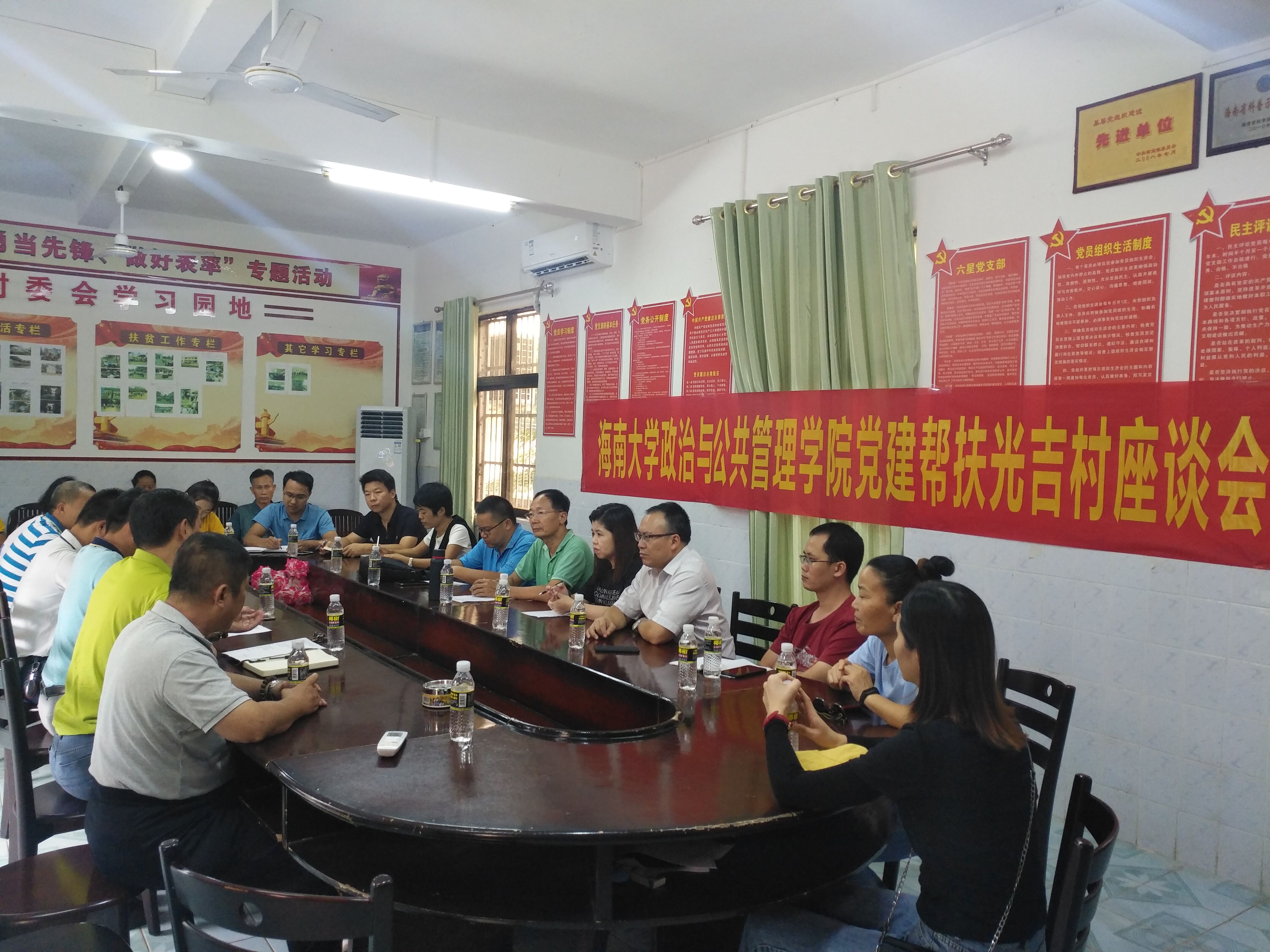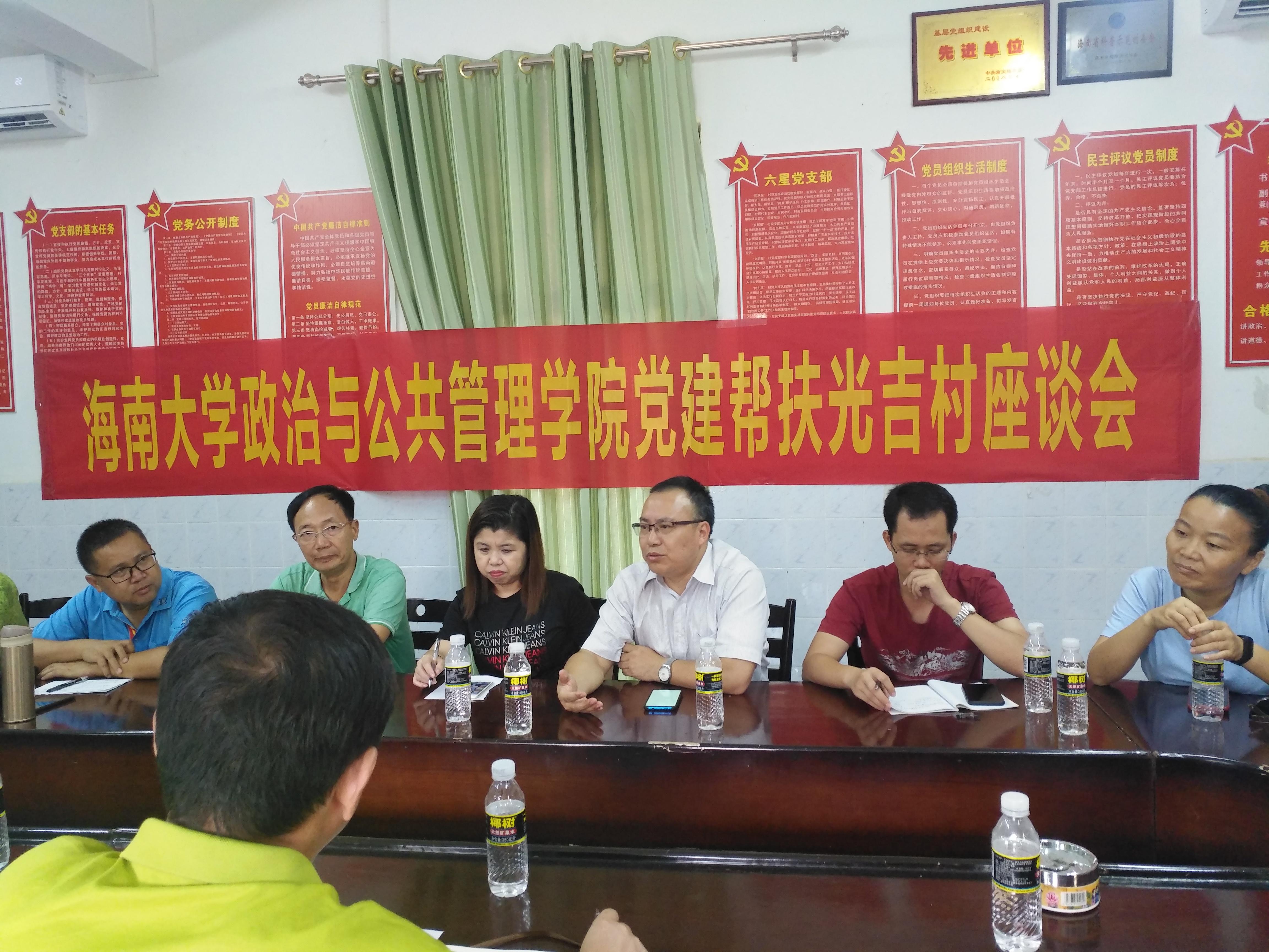 学院党委王默忠书记在座谈会上强调,海南大学党委、政管学院党委都高度重视对光吉村的扶贫工作,院党委积极落实学校党委关于抓党建、促脱贫帮扶对接工作,并表示学院会积极尽力而为,持续高位推进此项工作。