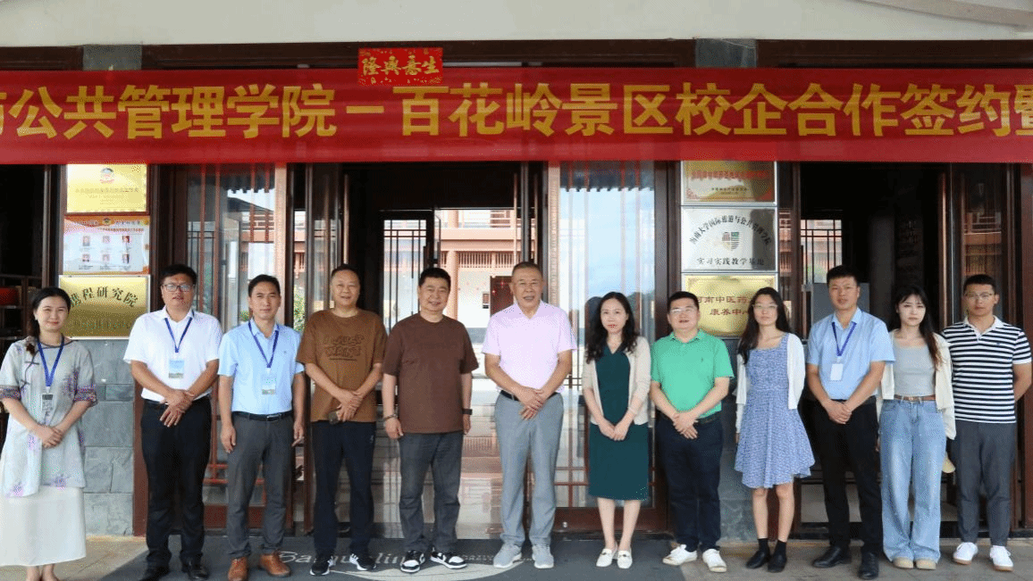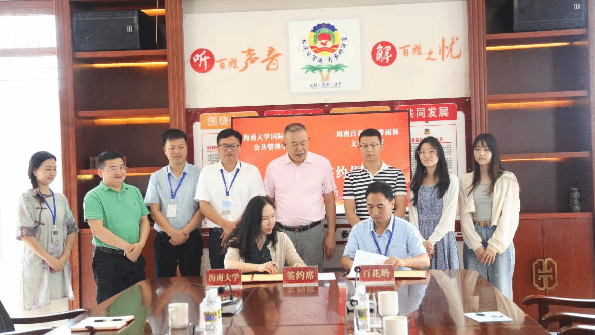 7月3日,我院执行院长徐艳晴、副院长何彪、教师代表谢灯明、博士生代表张沁雯和今朝书院辅导员石青纯一行前往百花岭热带雨林文化旅游区签署院企合作协议并举行挂牌仪式。百花岭热带雨林文化旅游区董事长李合岭、副总经理朱曾贤、常务副总经理马宝记等出席并参与座谈。