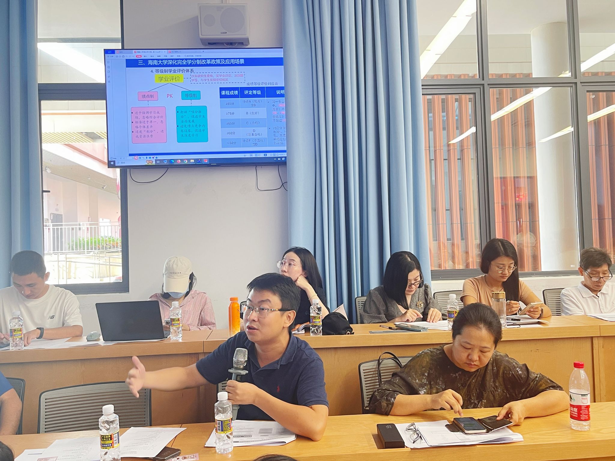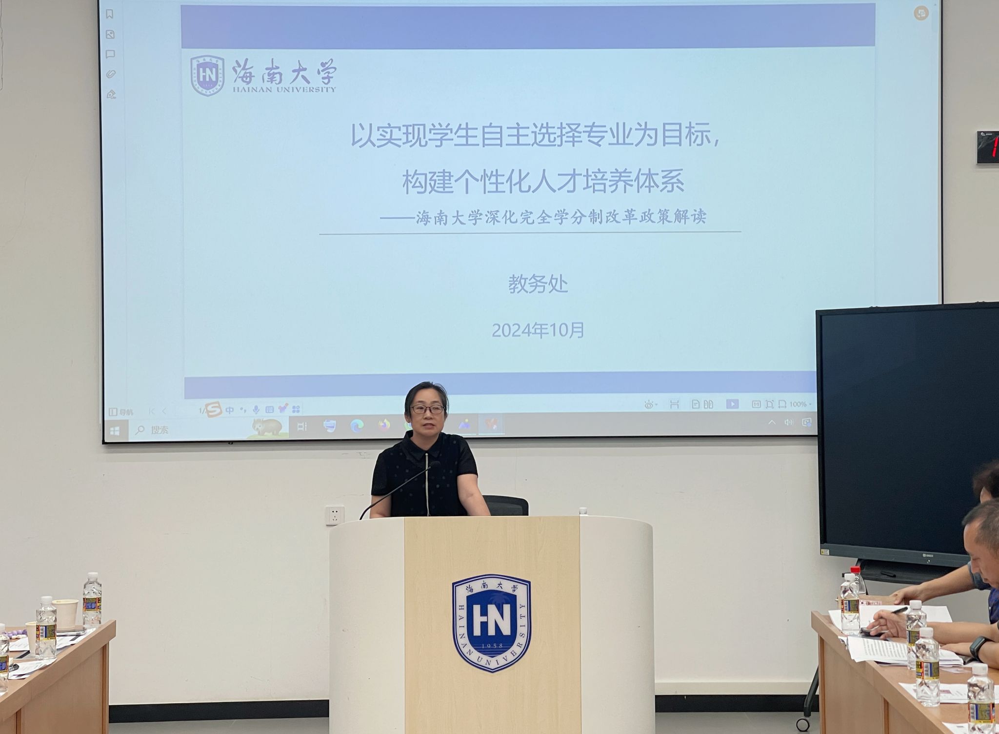 大会的第一个阶段,李玉凤副院长为大家做详细的政策解读,她从海南大学为什么要深化完全学分制改革、海南大学完全学分制改革历程、海南大学深化完全学分制改革政策及应用场景、本科生如何在海南大学找到自己的舞台等四个方面进行了全面阐述。不仅阐释了改革的背景、目标及具体实施策略,还强调了改革对学生个性化发展和自主学习能力提升的重要性。她指出,完全学分制改革以学生为中心,以学生自主选课为基础的,将为学生提供更灵活的课程选择,使他们能够根据个人兴趣和职业规划,构建符合自身需求的学习路径,从而更好地适应未来社会的多元化需求。此外,李玉凤副院长还详细介绍了学分制改革将如何优化课程结构,增强课程的实践性和应用性,以培养学生的创新能力和解决实际问题的能力。