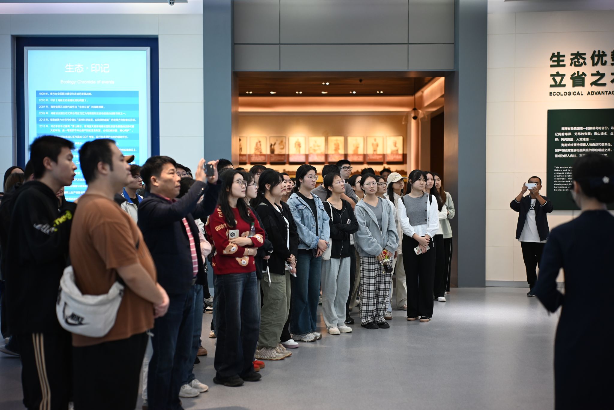 随后,师生们来到二楼,观看了海南省生态景观变化视频。视频中展示了海南丰富多样的生态景观,如热带雨林、广袤海洋等,以及随着时间推移这些景观所发生的变化,使学生们深刻认识到生态保护在城市规划中的重要性。接着,师生们参观了海南省规划的发展历程展示区,这里详细介绍了建省以来规划的发展变化,通过不同时期的规划方案对比,学生们清晰地看到海南城市规划如何随着时代发展、政策导向和社会需求而不断调整与完善。