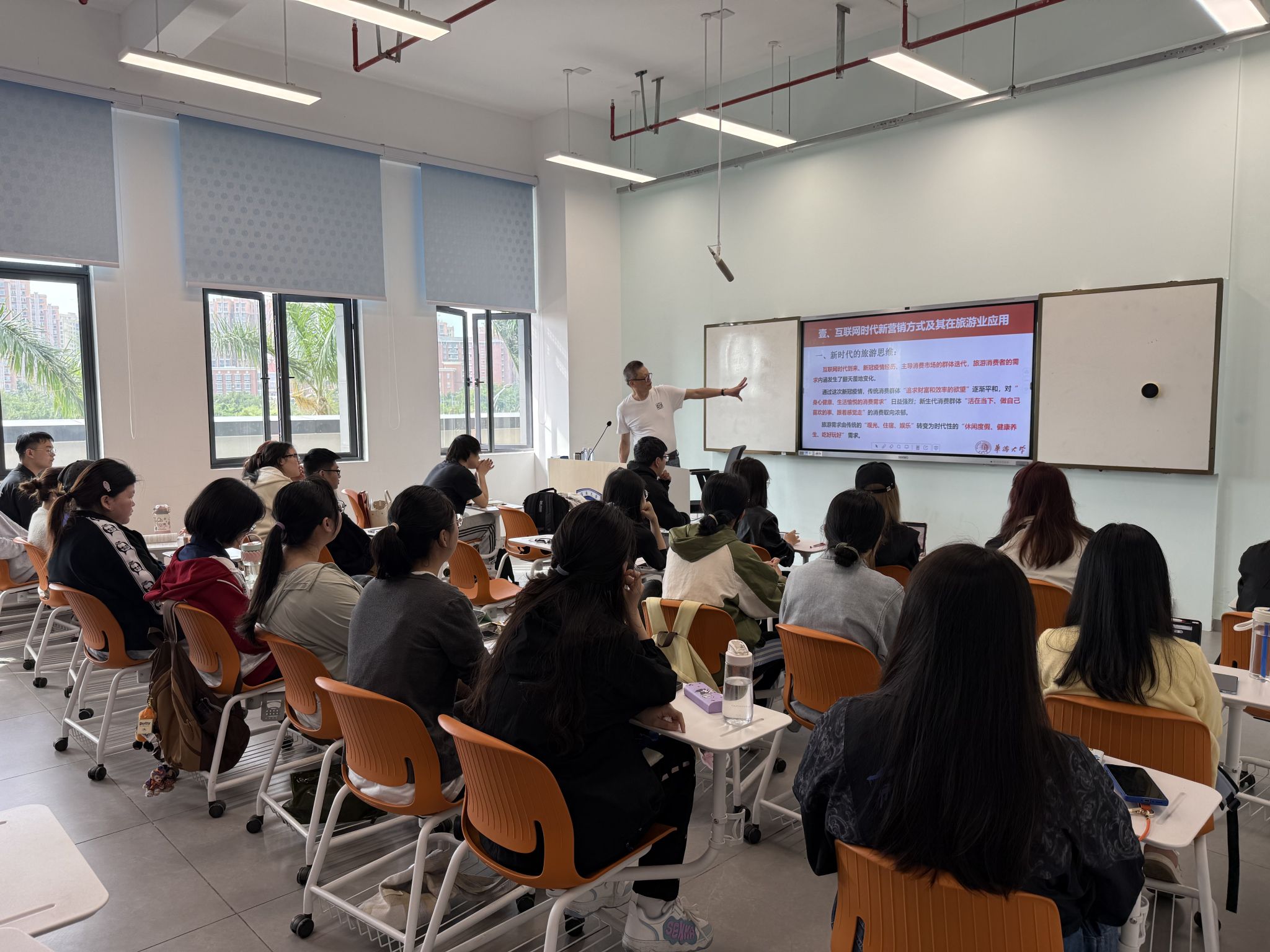 当日晚上,郑向敏教授在观澜湖校区3-A103教室举办了面向全院师生的以《时代变更中的旅游营销发展与迭进》为主题的学术讲座。讲座开始前,william威廉中文官网郭强书记代表学院向郑向敏教授的到来表示热烈的欢迎和衷心的感谢。郭书记表示,郑教授作为旅游行业的著名专家,拥有丰富的理论和实践经验,相信他的讲座将为同学们带来宝贵的启示和收获。随后,郑向敏教授结合自己多年的研究和实践经历,运用大量生动形象的案例,深入浅出地分析了时代变更对旅游企业的影响以及市场营销理念和方式的变革。他从时代变更与企业的时代性转折入手,详细阐述了企业如何跨渠道整合营销,形成协同作用;接着,他从数字化时代市场营销的角度,探讨了新的市场环境下旅游营销的创新策略和发展趋势。郑教授的讲座内容丰富、条理清晰,既有理论深度,又贴近实际,赢得了在场师生的阵阵掌声。