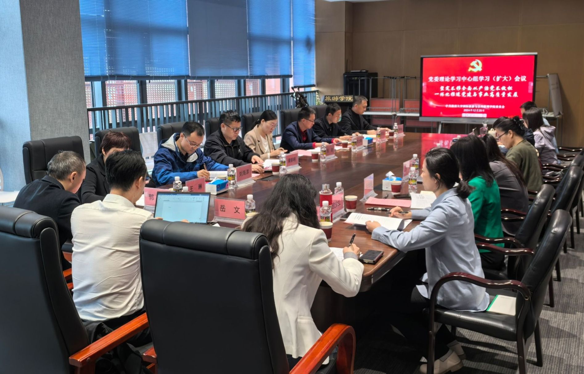 2024年12月25日下午,校党委常委、副校长岳文到我院调研指导工作,并旁听党委理论学习中心组第17次学习(扩大)会议。学院领导班子成员、党委委员、党支部书记、责任教授、党外人士、系办负责人参会,会议由学院党委书记郭强主持。
