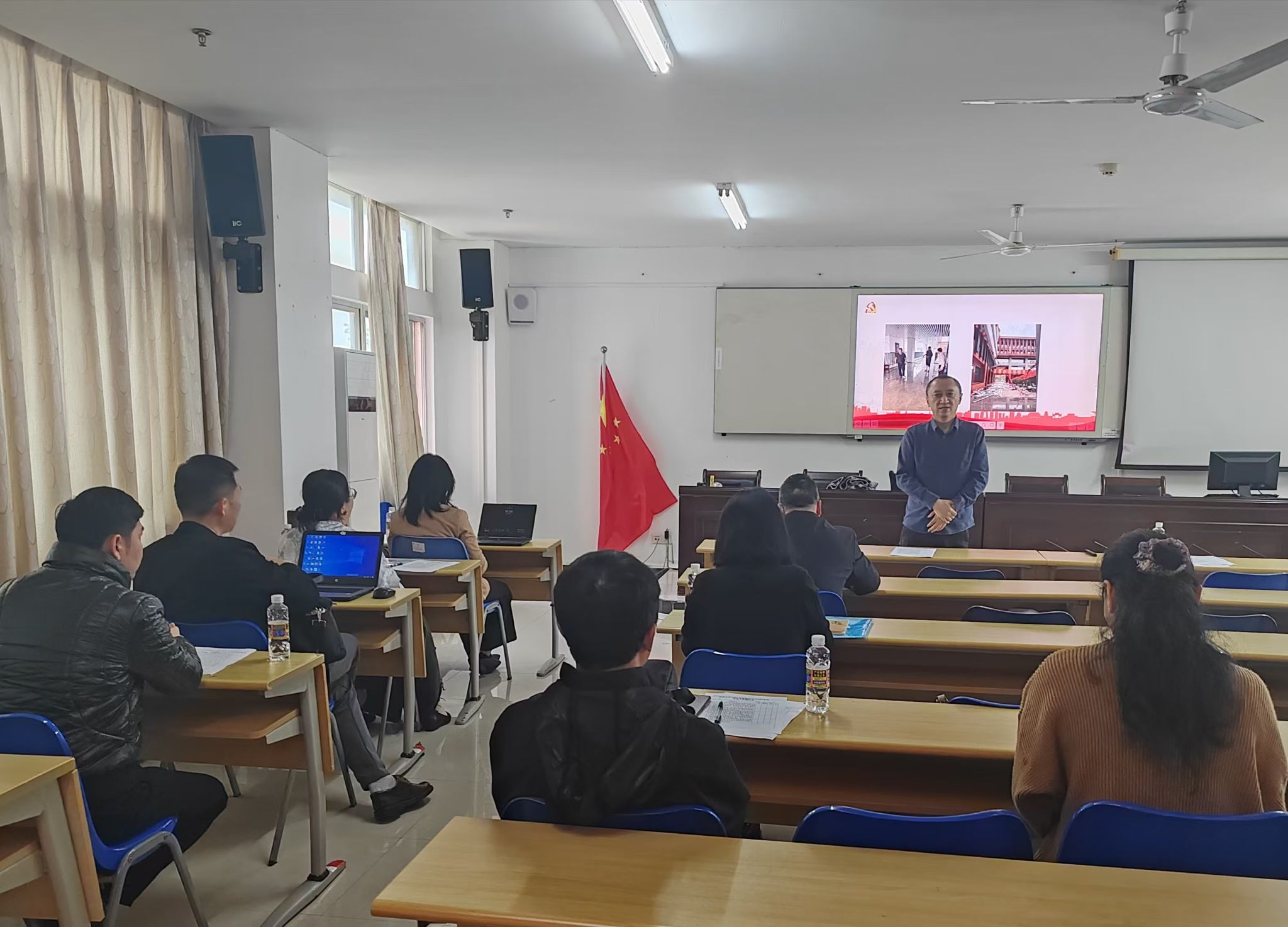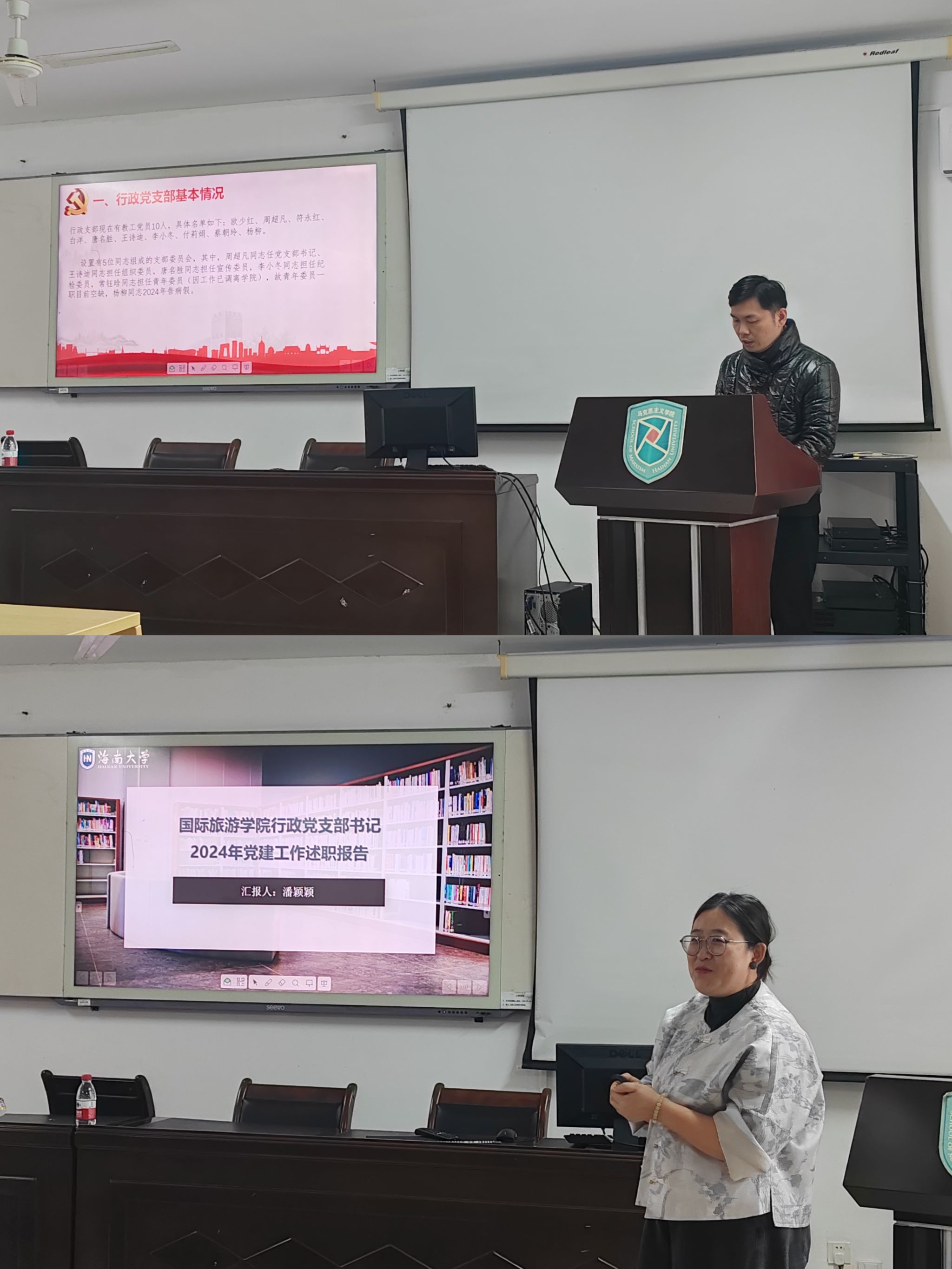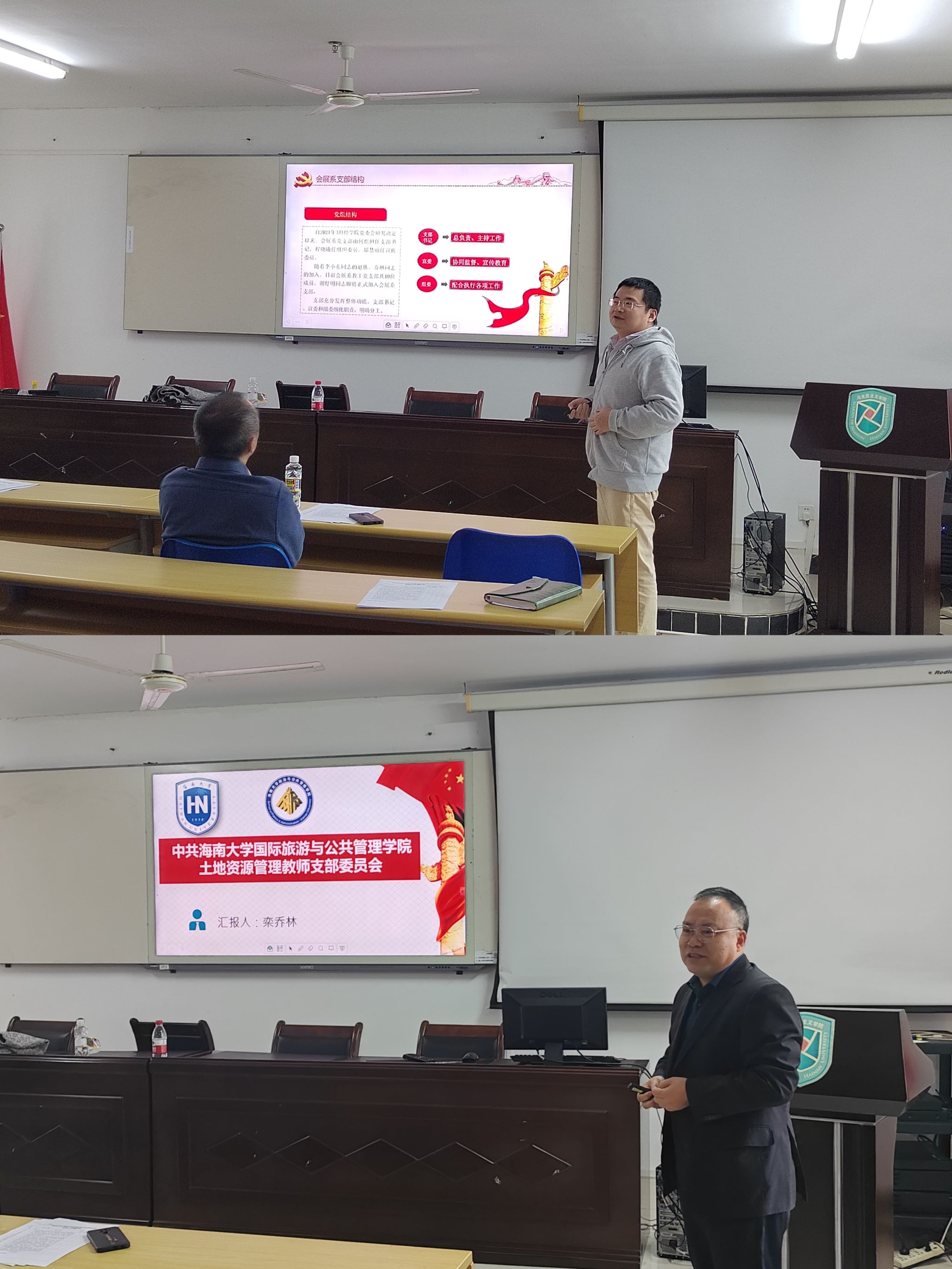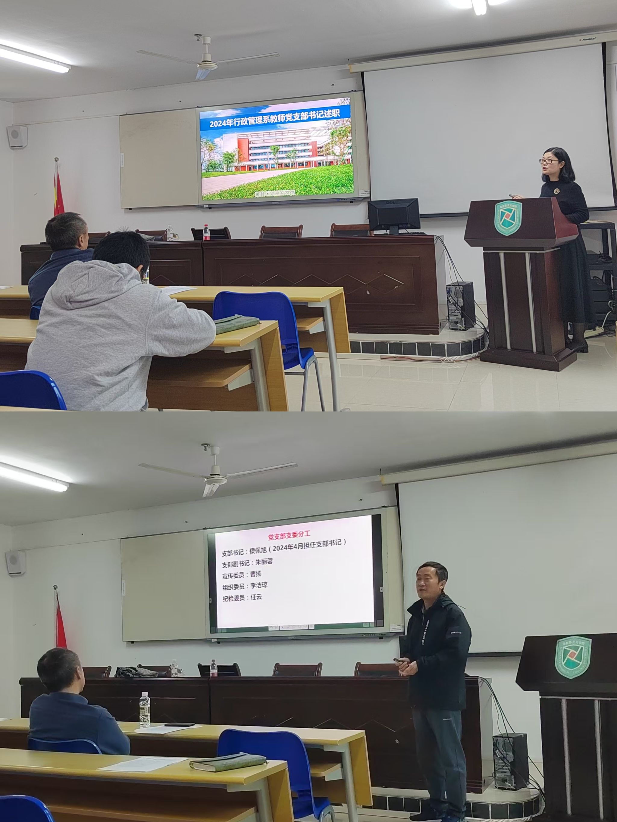 会议伊始,郭强对过去一年学院的党建工作进行了简要回顾,并对各党支部的辛勤工作表示感谢。七位党支部书记依次进行述职。会展经济与管理系教师党支部书记何彪、行政党支部书记周超凡、土地资源管理系教师党支部书记栾乔林、旅游管理系教师党支部书记侯佩旭、行政管理系教师党支部书记赵晓歌、酒店管理系教师党支部书记黄建宏、国际旅游学院行政党支部书记潘颖颖从成绩清单、问题清单和未来工作展望等方面进行了详细汇报。