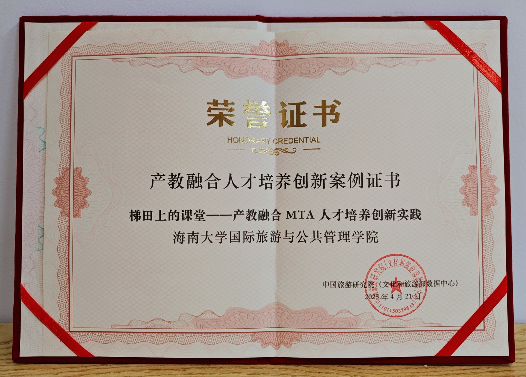 2025年4月20日至21日,由中国旅游研究院主办的2025中国旅游科学年会在北京隆重召开。本次年会以“‘十五五’时期旅游业发展战略”为主题,聚焦旅游基础理论创新、目的地融合发展、企业实践转型等核心议题,并通过线上线下结合的形式,发布了多项行业权威成果。由我院刘海洋教授、范士陈教授指导的“梯田上的课堂——产教融合MTA人才培养创新实践”项目获评“产教融合人才培养十佳案例”。
