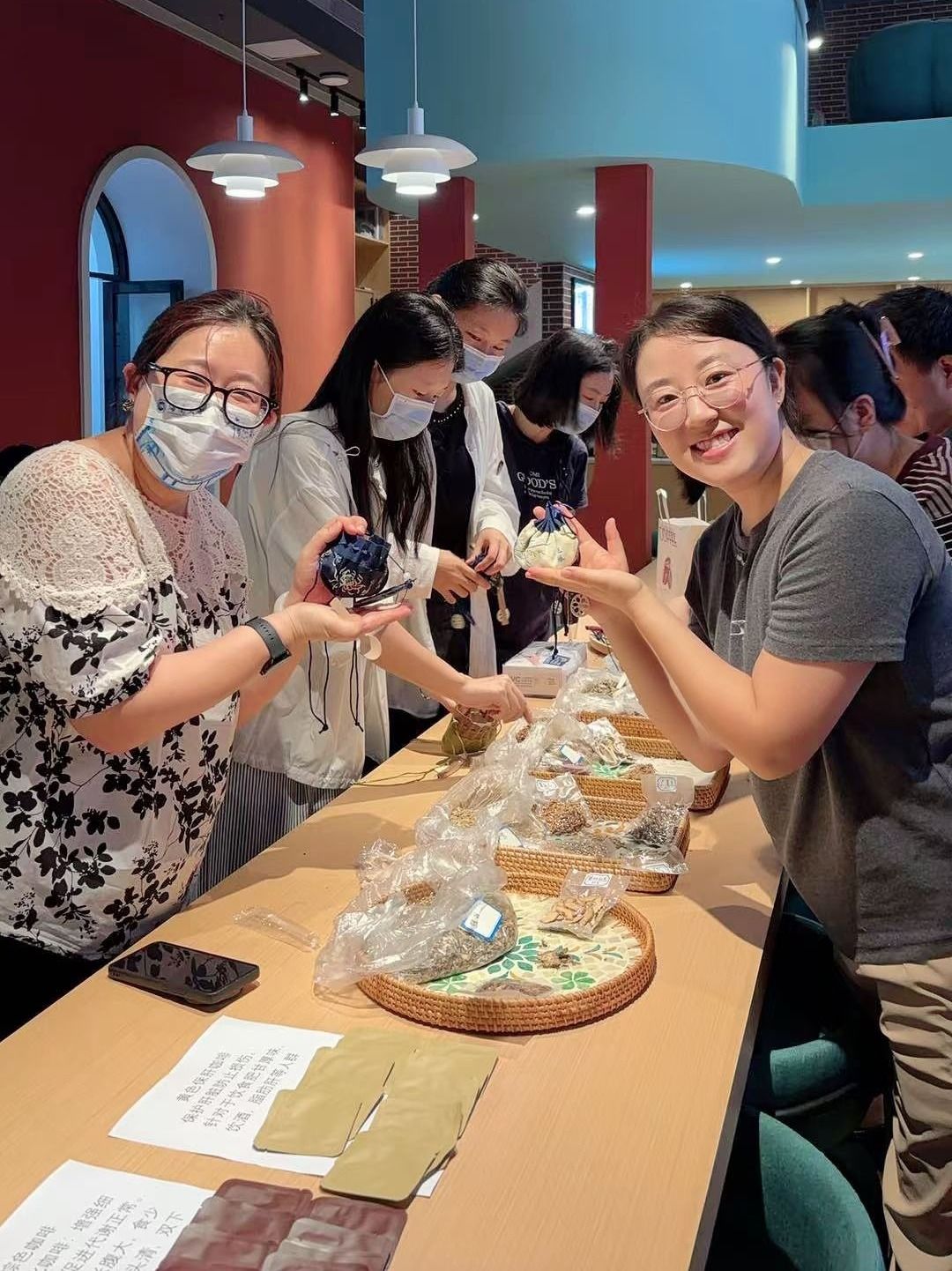 此外,手工 DIY 中草药香囊区域同样热闹非凡。现场提供多种具有提神、防流感、治鼻炎、防焦虑等功效的中药材,老师们在药师的指导下,根据自身需求,亲手挑选药材制作专属的中草药香囊。大家相互交流、学习,既收获了独特的端午礼物,又掌握了不少中药材知识。