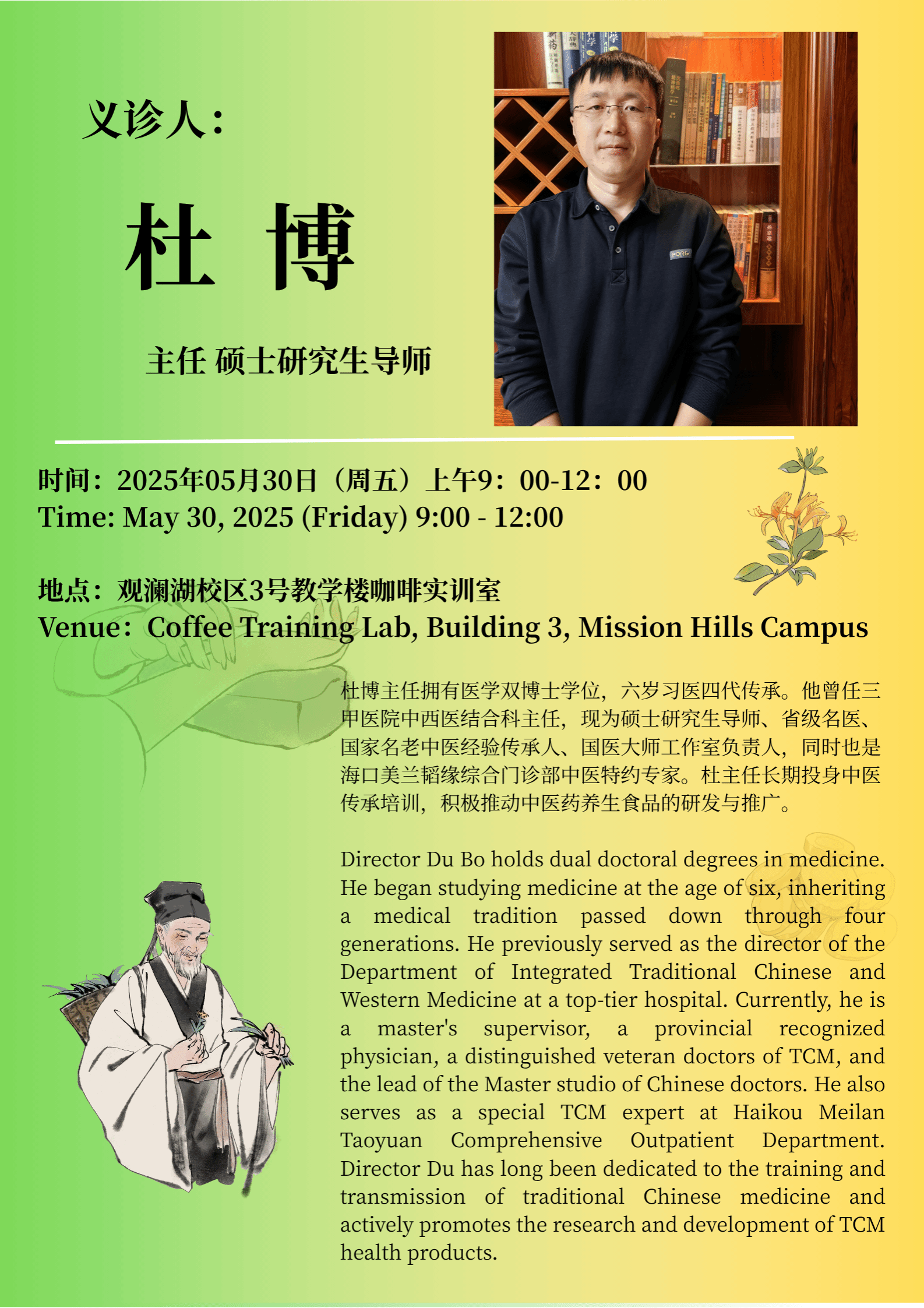 学院院长王琳首先向莅临活动的国医大师杜博及其团队表示热烈欢迎与诚挚感谢,院长在欢迎辞中提到,中医药文化是中华民族的瑰宝,承载着千年的智慧与传承。在端午节这个具有深厚文化底蕴的传统节日里,举办中医药文化体验活动,既是对传统文化的致敬,也是我们弘扬中医药文化、推动其薪火相传的重要举措。希望大家能通过此次活动,切身感受中医药的魅力。