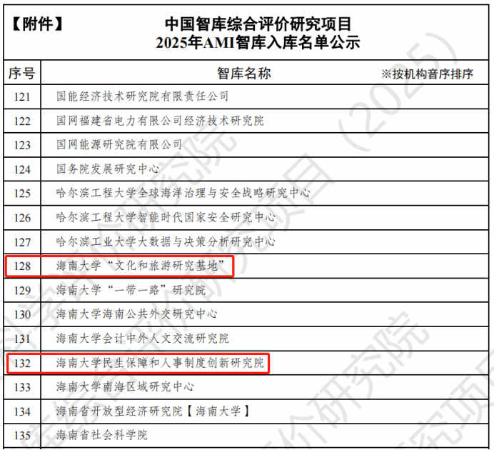 7月25日,中国社会科学评价研究院公布了“中国智库综合评价研究项目(2025)AMI智库入库名单”。我院所属学科的两个科研平台——海南大学“文化和旅游研究基地”、海南大学“民生保障和人事制度创新研究院”——成功入选。
