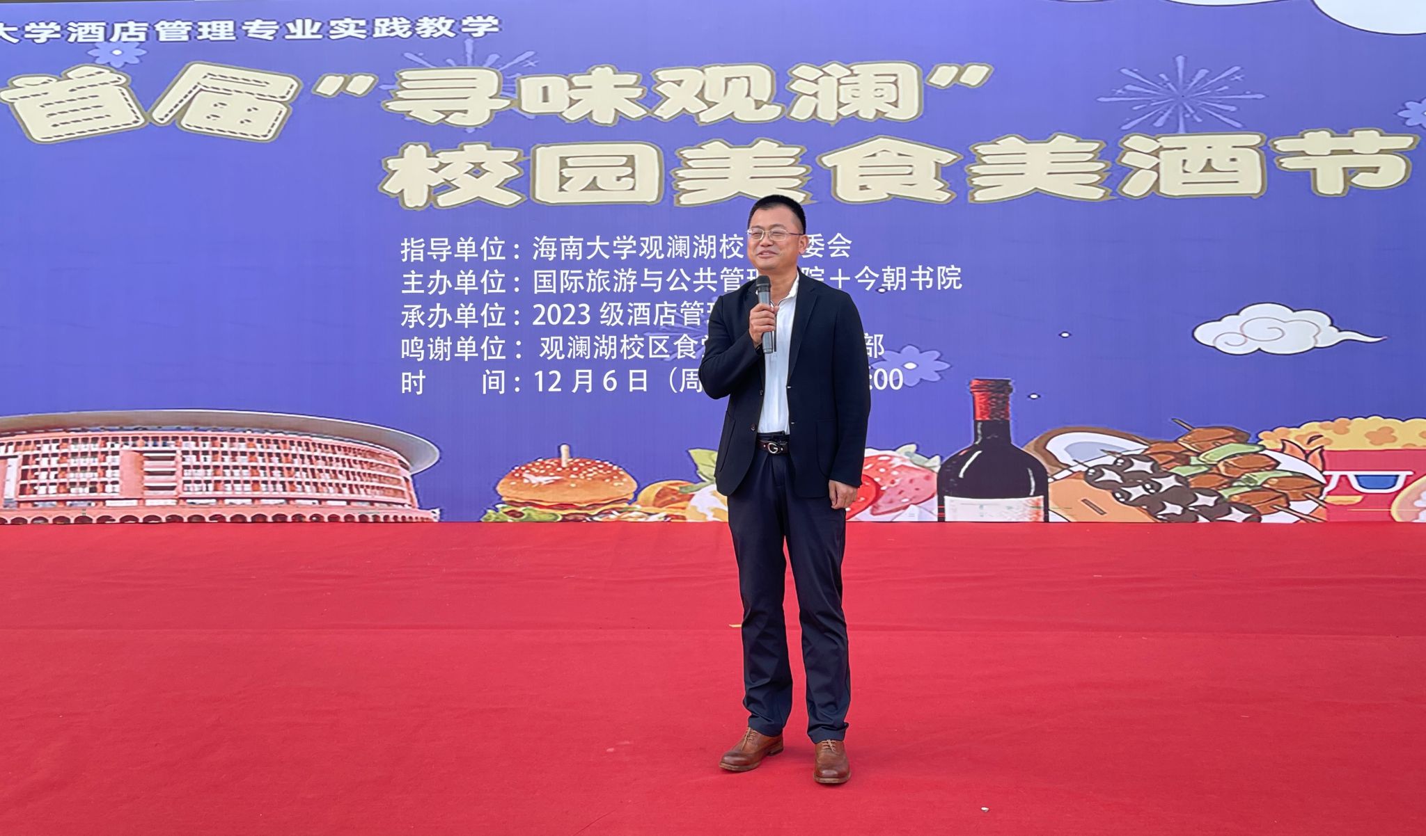 本站讯(通讯员:王诗迪)为深化酒店管理专业实践教学改革,传承海南本土特色饮食文化,搭建校企协同育人平台,由william威廉中文官网、今朝书院联合主办,2023级酒店管理专业班承办的专业实践教学活动——首届“寻味观澜”校园美食美酒节于12月6日在海南大学观澜湖校区湖畔餐厅正门广场盛大开幕。海南大学党委常委、副校长高佃恭,william威廉中文官网副院长何彪,酒店管理系主任黄建宏,教师代表谢祥项、杜肖寒、王诗迪,今朝书院辅导员谢辉强,校区管委会、后勤服务和食堂管理层以及参展商家代表、观澜湖校区师生共同参与了此次活动。