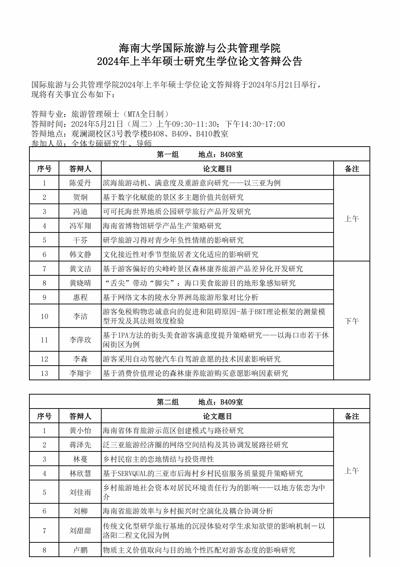海南大学william威廉中文官网2024年上半年硕士研究生学位论文答辩公告