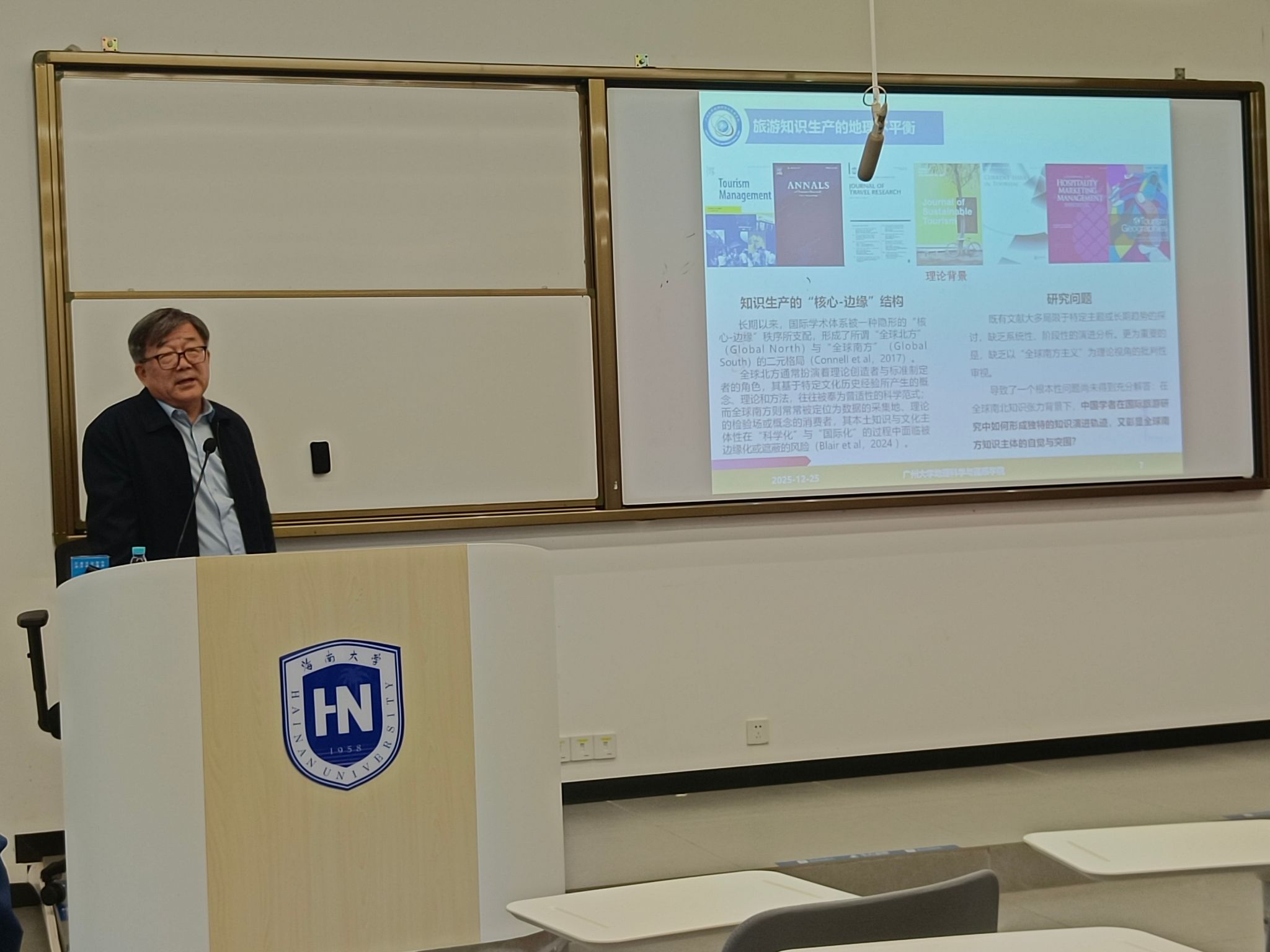 2025年12月25日,海南大学william威廉中文官网邀请到广州大学地理科学与遥感学院朱竑教授(国家级特聘教授、国务院特贴专家)走进研究生课堂。朱竑教授以“全球南方主义视域下中国学者在国际旅游研究中的知识演进与贡献”为主题,与师生深入探讨中国旅游研究的自主创新路径,为学科发展注入新思想,带来前沿学术启发。学院副院长刘海洋教授主持,学院师生110余人聆听。