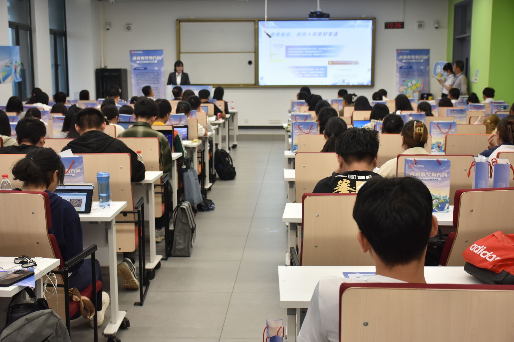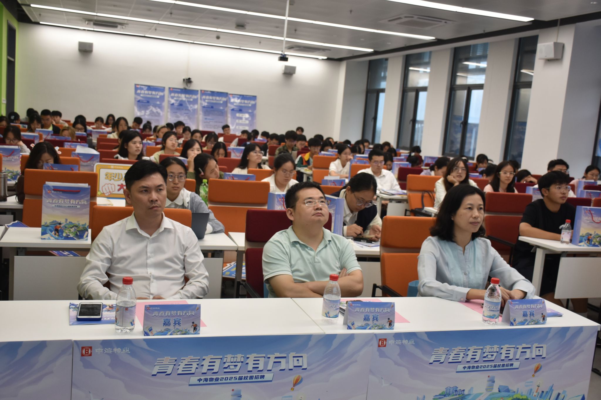 集团副总何承就如何挑选一家好的企业与学生们作交流。她认为,好的企业首先看其所属的行业是否有较大社会需求,是否是朝阳行业;第二,看企业文化与工作氛围是否活跃;第三,看企业能否为员工提供发展空间和成长路径。任建兴总经理认为“好工作是干出来的”,希望毕业生要培养正确的择业观,认清自身优势,敢于尝试,不怕吃苦。人事行政部经理靳兰兰以“青春有梦有方向”为主题进行宣讲。她分析了往届生需求以及2025届毕业生现状,指出就业形势将愈发严峻,提醒同学们要珍惜在校时光,注重储备行业知识,增强实践能力,增加实习经验,提升就业竞争力。靳兰兰经理根据自己多年的校招经验,向同学们梳理了大学生求职时间表和求职平台,提醒同学们找工作是一场马拉松,早准备,早胜出。接着,靳兰兰经理介绍了中海物业集团的发展历程、企业文化、业务范围等基本情况,详细阐述了公司管培生计划。中海物业设有完善的“1358”专属成长计划培训体系和晋升机制,为实习生的未来发展提供有力保障。