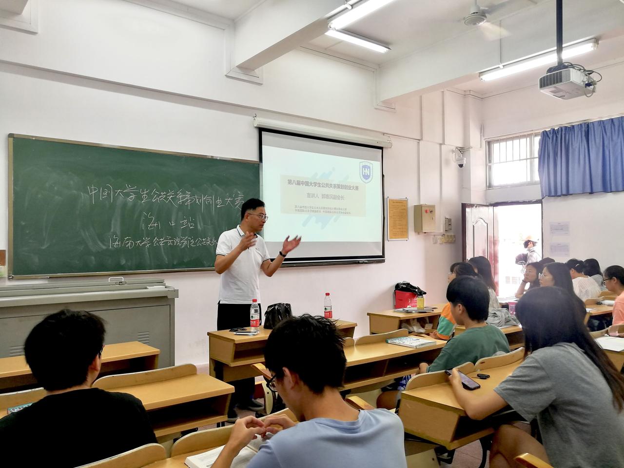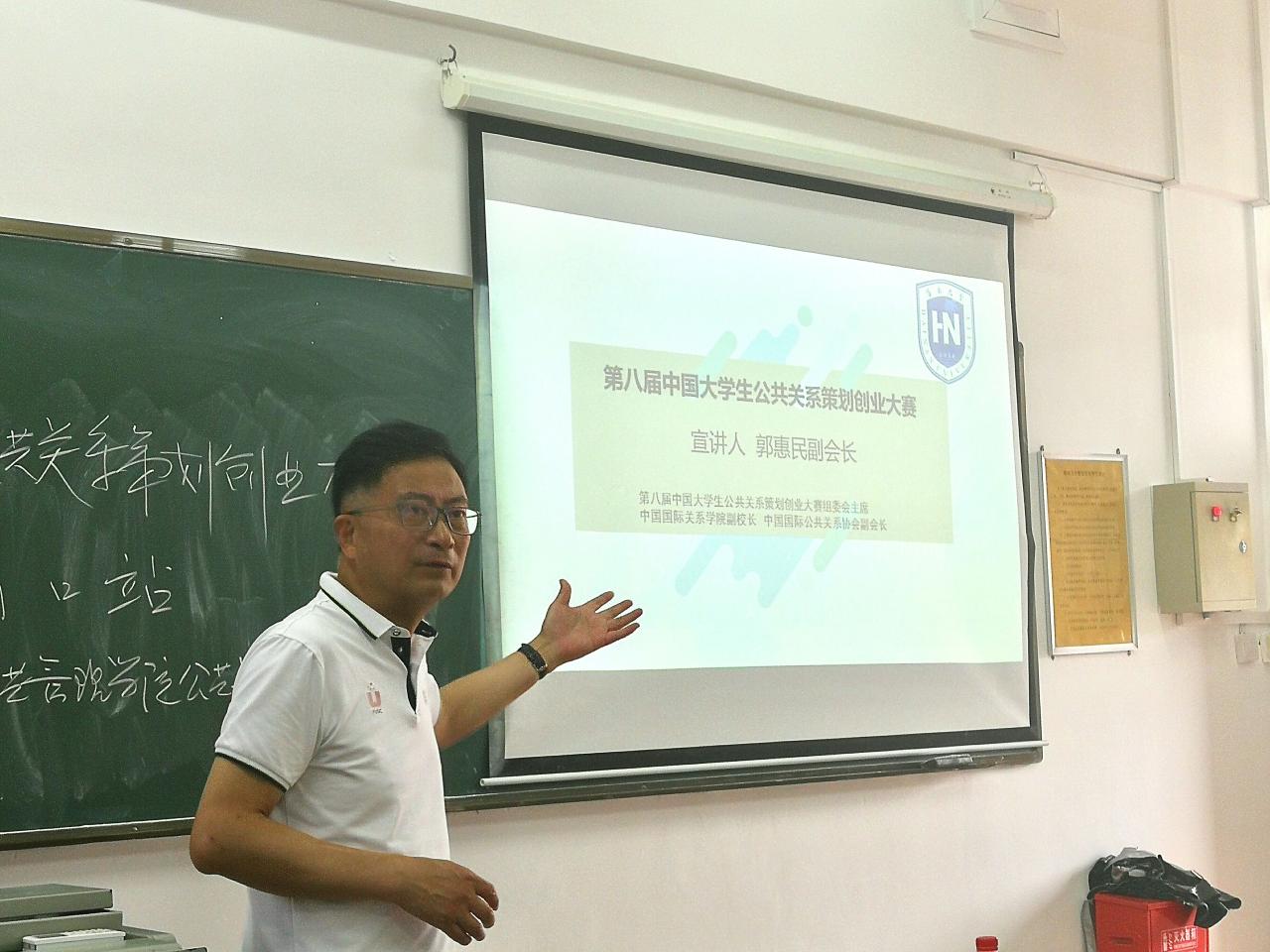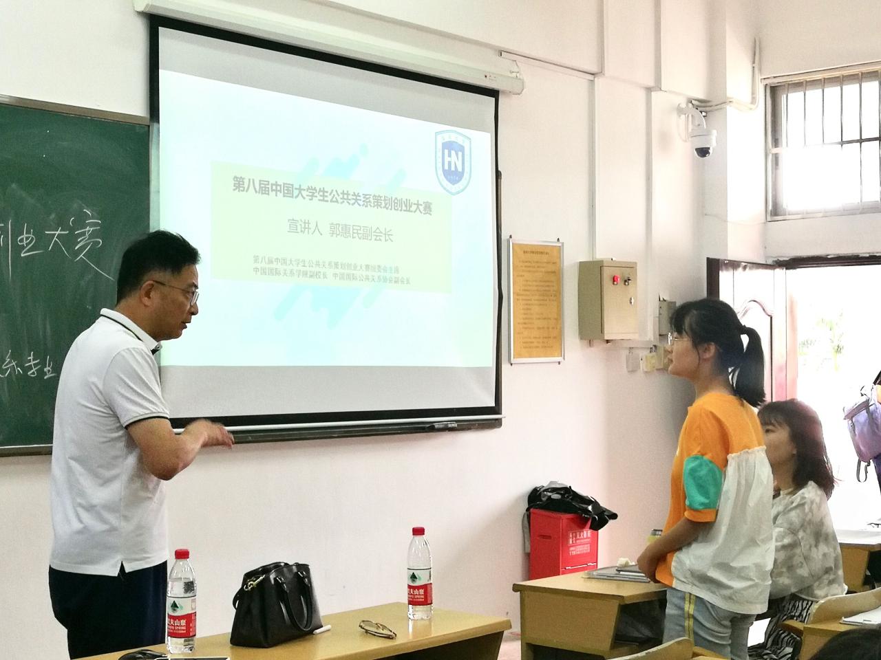 2021年5月25日上午10:00,第八届中国大学生公共关系策划创业大赛巡讲会(海口站)在我校海甸校区2-302举行。中国国际关系协会副会长、第八届中国大学生公共关系策划创业大赛组委会主任郭惠民教授为本次巡讲会的主讲人。