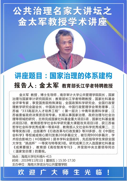 金太军教授,博士生导师,南京审计大学公共管理学院院长,国家治理与国家审计研究院院长;国家社科基金会评专家,享受国务院政府特殊津贴,全国政策科学研究会、全国行政管理教学研究会副会长,中国政治学会、中国行政管理学会常务理事,江苏省“333高层次人才培养工程”(第一层次)中青年首席科学家,江苏省委省政府决策资咨询专家。长期从事国家治理、政府治理与社会治理等领域的研究,主持完成国家社科基金重大项目1项,国家社科基金重点项目2项、教育部哲学社会科学研究重大课题攻关项目1项,获江苏省哲学社会科学优秀成果一等奖4项,教育部人文社会科学优秀成果二、三等等奖各1项,出版著作《行政改革与行政发展》等30多部,在《中国社会科学》等权威或核心期刊发表200多篇论文,被引用9000多篇次,学术综合影响力(HD指数40)居本学科全国前列,先后指导学生荣获全国大学生“挑战杯”一等奖与特等奖3项。研究成果三次入选国家社科基金《成果要报》、教育部《高校智库专刊》,并受到中央主要领导同志(温家宝总理)的重视。