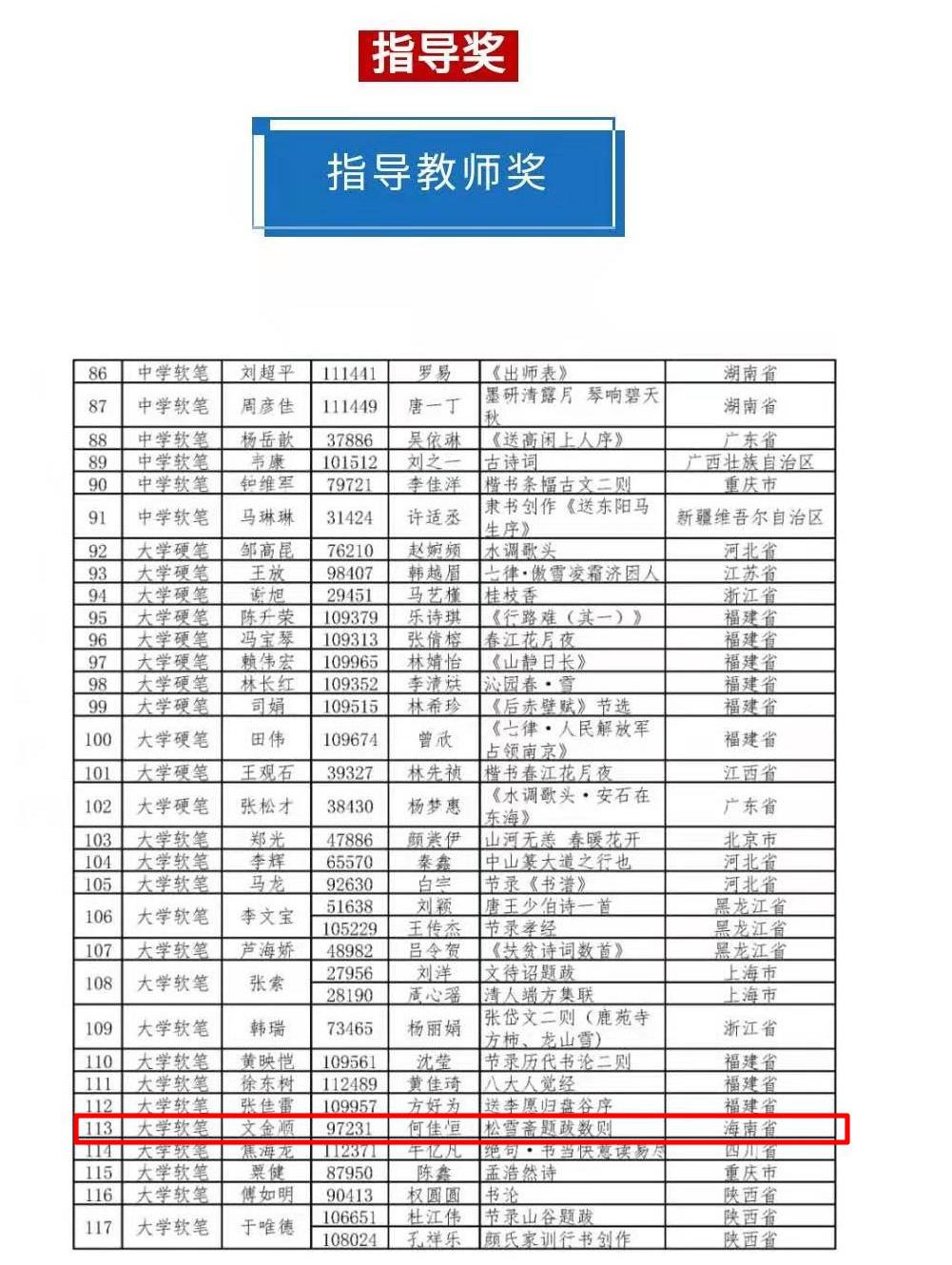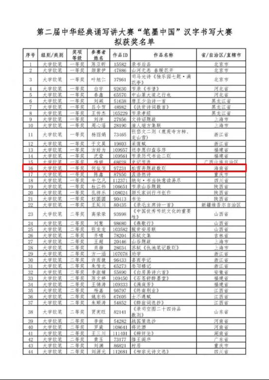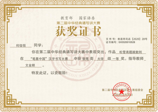 近日,在教育部、国家语委主办的2020年第二届中华经典诵写讲大赛—“笔墨中国”汉字书写大赛中,我院人文地理与城乡规划2019班的何佳恒同学的作品《松雪斋题跋数则》在”大学软笔“组中获得全国一等奖,是该组别海南省唯一的一等奖(在全部组别比赛中,海南省共2个作品获全国一等奖),文金顺老师获得优秀指导老师(全省共2个)。据悉,2020年5月10日至8月10日,“笔墨中国”汉字书写大赛完成了初赛作品征集,共收到参赛作品近12万件。9月-10月,经过初赛、决赛评审,共评选出硬笔类小学组、中学组、大学组、教师组、社会人员组;软笔类小学组、中学组、大学组、教师组、社会人员组共10个组别,总计3336件获奖作品,指导教师奖117名。在海南赛区比赛中共有150多个作品参赛。