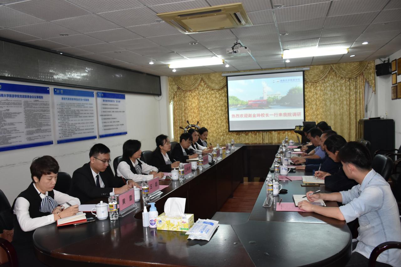 11月10日上午,海口旅游职业学校党委书记、校长赵金玲,副校长杨英,教务处主任潘雪梅,招就处主任王春萍,校办副主任杨颜菲,旅游管理系教师王超、黄蕾一行来我院调研交流,并在学院205会议室进行座谈。我院院长郭强、党委书记韩力光、副院长谢祥项、旅管系系主任侯佩旭、酒店系系主任刘雪莲、综合办主任周超凡出席交流座谈会。