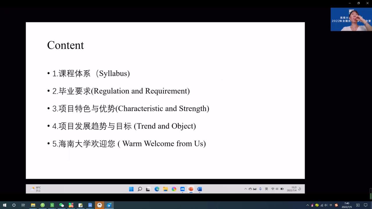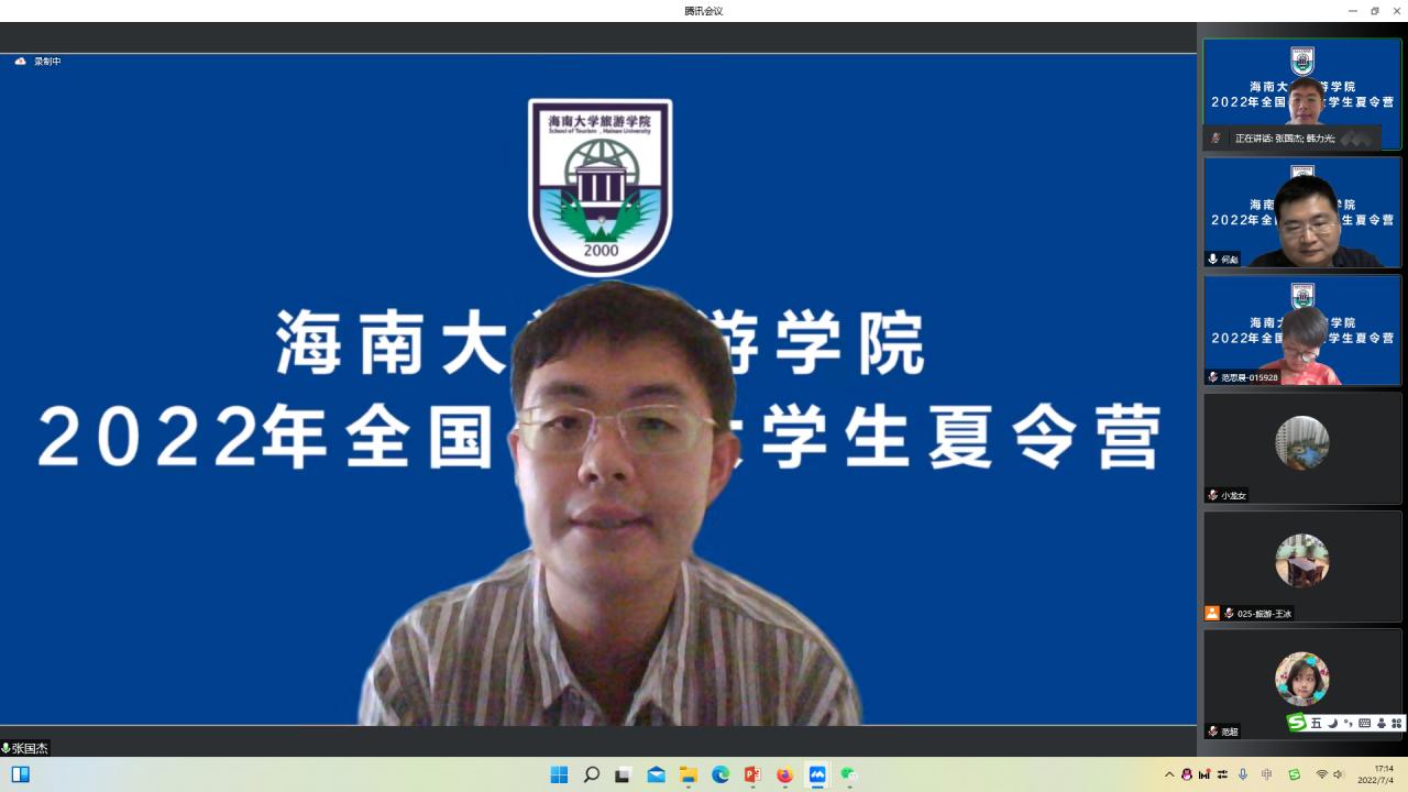 7月4日下午15:00,海南大学旅游学院2022年全国优秀大学生夏令营开营仪式在线上召开,由我院何彪副院长主持,学院郭强院长、韩力光书记、何彪副院长、谢祥项副院长、张珊副院长、刘雪莲副院长、旅游管理硕士点负责人王红教授、各系主任、各办主任出席了开幕仪式。郭强院长在开营仪式上致辞,首先对来自全国各地的优秀大学生表示热烈的欢迎。郭强院长先给同学们分析了中央给海南建设中国特色自由贸易港的政策优势,接下来从我院学科发展、师资规模、本硕博一体化教育的情况做了简要介绍,并希望参加本次夏令营的同学能够报考我们海南大学旅游学院,最后祝愿本次参加夏令营的同学能够精彩展示自我、脱颖而出,取得好的成绩。