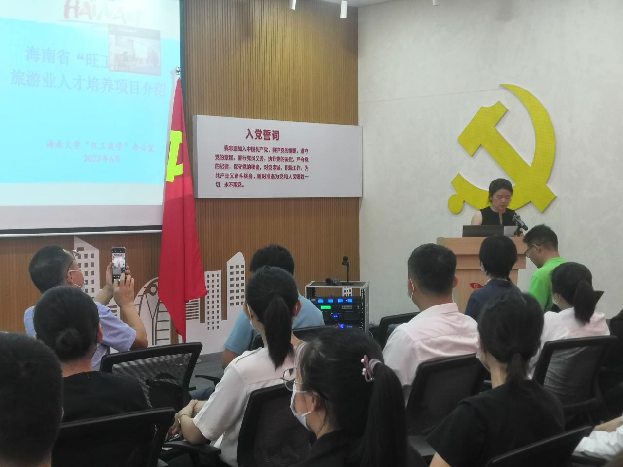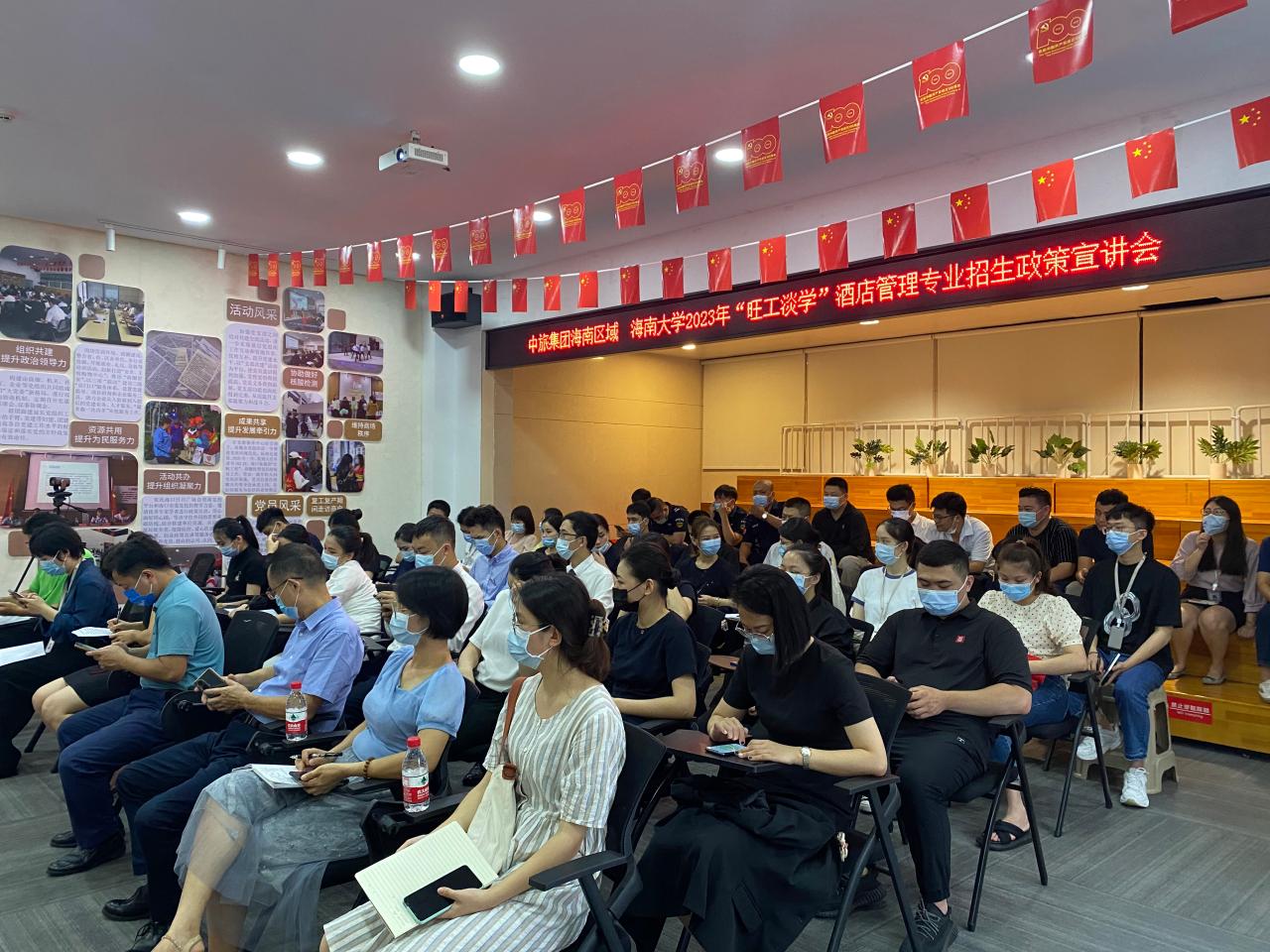 2022年6月24日上午,应中国旅游集团海南区域总部邀请,海南大学“旺工淡学”项目组谢祥项副院长一行4人前往旗下中免集团海口日月广场店开展“旺工淡学”2022年招生政策宣讲工作,中免集团海口日月广场店总经理林蕾、中旅集团海南区域总部党群部唐瑞、项目办负责人吴鸿、项目办工作人员、线下员工代表50余人及来自海口、三亚、博鳌及美兰凤凰两大机场店的800余名员工通过线上的方式参加了政策宣讲会,宣讲会由公司人力资源部经理林珈羽主持。