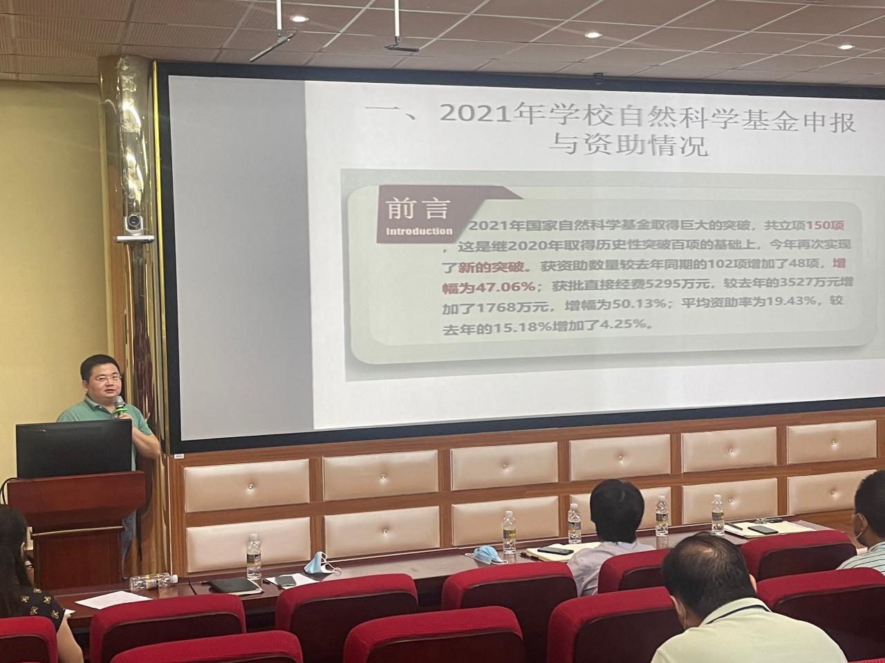 最后,何彪副院长就2021年学校国家基金申报与资助情况展开了汇报。他对比了学校与学院的申报和资助情况,指出今年学院所取得的成绩和存在的问题,希望老师们要在学院的指导下,积极申报自科、社科基金,协同开展有组织的科研活动。