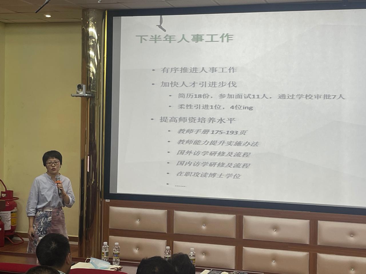 接着,张珊副院长就其分管的人事、财务、专业认证及行政管理等四个方面的工作展开了汇报。张珊副院长对学校现阶段人才队伍的基本情况、“十四五”期间学校的人才队伍建设规划进行了分析,提出了下半年学院的人才引进工作设想;接着她对学院新推出的三级财务管理制度及报账流程作了详细说明;随后她对专业认证的进展情况及日常的行政管理工作要点进行了通报。