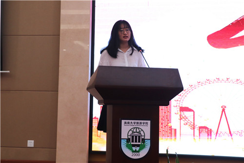 听完了前辈们的悉心教诲,新生代表19级旅管一班的张谈睿灵同学也代表新生描述了自己刚进入大学的心绪以及对未来的信心和展望。