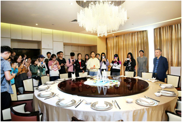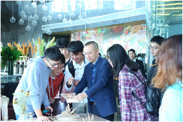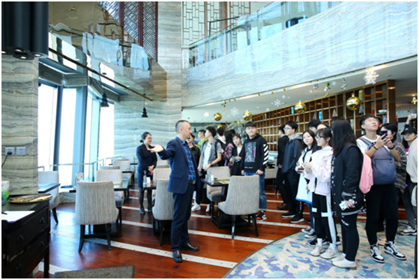 首先,郭强院长通过实地参观酒店三楼、四楼和三十三楼,并就餐厅接待方面进行细心讲解。在三楼宴会厅参观婚礼晚宴场地,对餐饮、婚礼晚宴和客人接待等方面有了初步的了解,更对书本中的理论有了更为深刻的记忆;四楼参观中餐厅时,通过郭强院长耐心的讲解,对餐厅装修风格、转盘装饰和餐厅主题相搭配营造出中式盛宴的视觉效果有了更独到的见解;此外,在酒店三十三楼的特色餐厅和全日餐厅参观时,何经理对餐厅进行基本介绍,之后郭院长为同学们讲解了餐厅选景的意义和相关菜品英文的合理表达以及如何利用英文对中式菜品进行简单介绍,让同学们意识到当今社会对复合型和创新性人才需求的重要性。