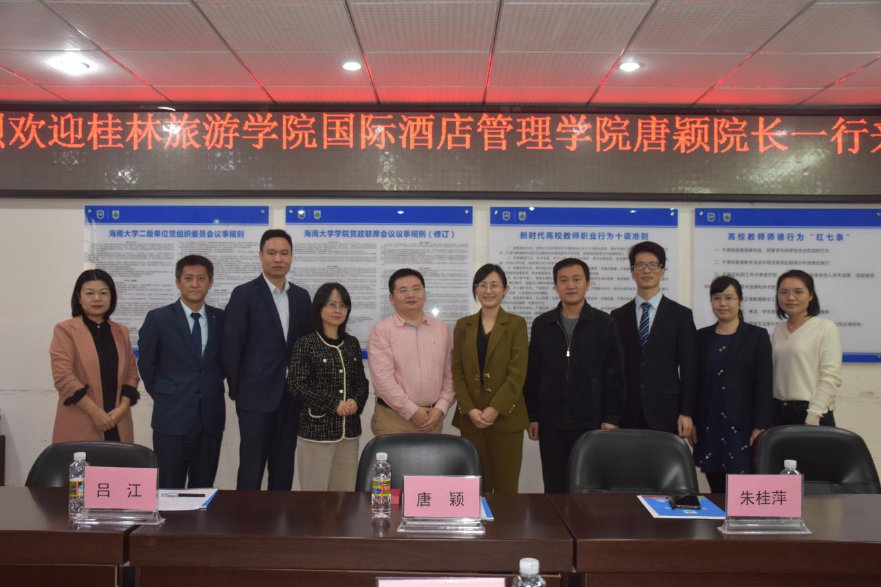 12月3日上午,桂林旅游学院国际酒店管理学院院长唐颖、副院长朱桂萍、相关专业骨干教师吕江、晏小华、全文景、蔡欣言一行到访我院开展相关调研工作。海南大学旅游学院副院长何彪、侯佩旭及教师代表参加了座谈会。