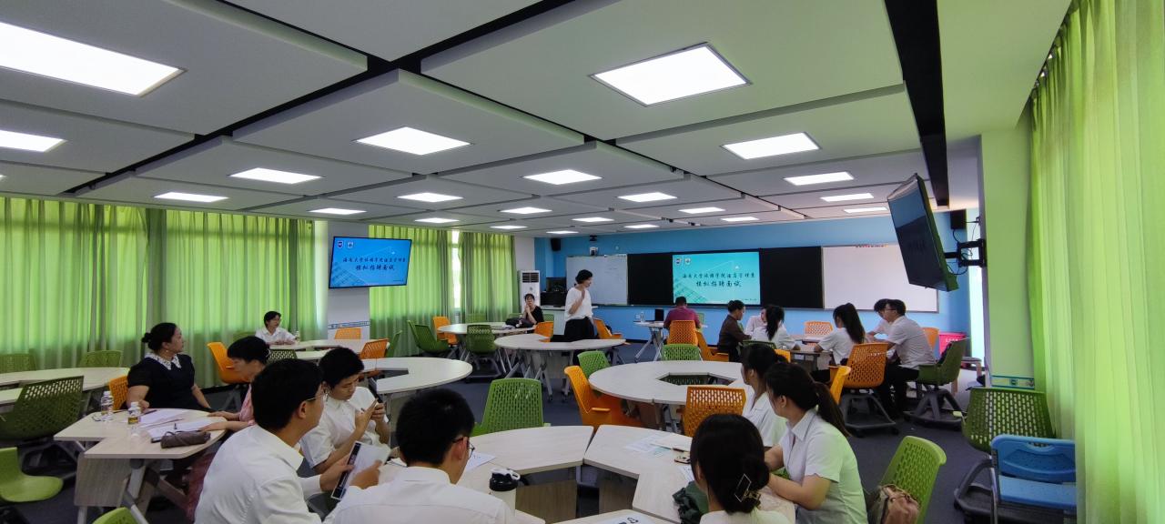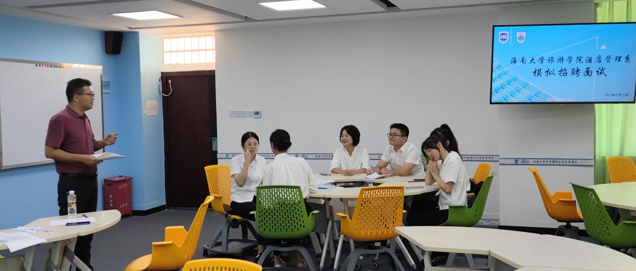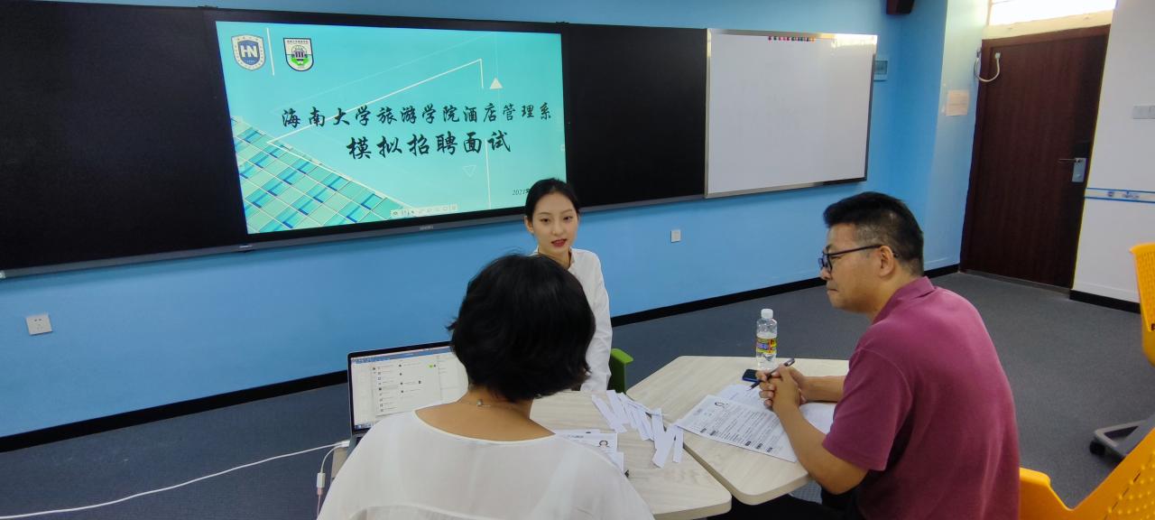 为提高毕业生就业面试能力和技巧,海南大学旅游学院酒店管理系组织策划了酒店管理专业模拟招聘面试的活动。模拟面试于2021年9月30日下午13:00在旅游学院8教502室开展,整场活动由酒店管理系系主任刘雪莲老师主持,谢祥项副院长、杜肖寒老师和高蓓蘅老师以面试官身份出席。活动过程中四位老师先后做了相关分享,对有意向在酒店行业就业的16位同学进行了一对一的招聘面试和就业的指导。