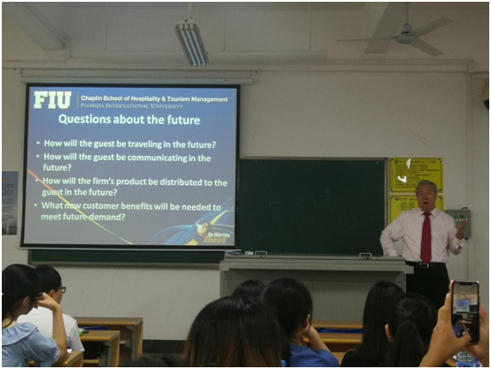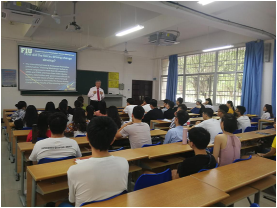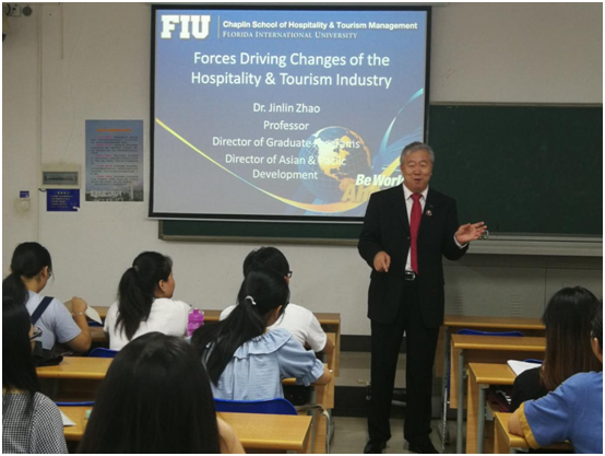 5月27日至6月5日期间,海南大学旅游学院2017级酒店管理专业两个班104位同学迎来了美国弗罗里达国际大学旅游与酒店管理学院终身教授赵金林博士的全英文授课。赵金林教授以酒店业战略发展和创新管理为主题,设计了Forces driving change、Competitive methods、Franchise and management contract、An environmentally sensitive approach等四个讲授主题和一次小组作业考核(Group presentation),两个班的小组作业重点考核了同学们用驱动力模型、环境分析模型等对酒店集团进行了分析并进行了PPT全英文分享,最后,赵教授对各小组的研究成果进行了点评。