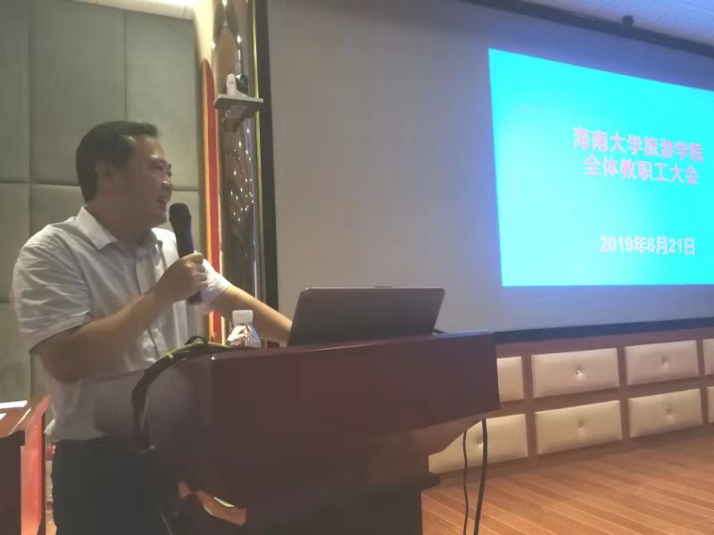 2019年6月21日下午,旅游学院召开了全院教职工大会。院长郭强、院党委副书记韩力光(主持党委工作)、副院长何彪、侯佩旭、谢祥项,以及全院各系(教研室)、各部门教职工共70多人出席了会议。