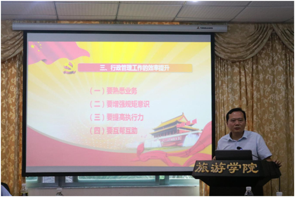 2019年11月7日下午,在旅游学院会议室8-205举办领导干部讲党课活动。本次党课主讲人是旅游学院党委韩力光副书记(主持党委工作),主题是“牢记初心使命 努力履职尽责 为学校创建世界一流学科建设国内一流大学贡献力量”,学校主题教育督导组罗玲球老师、李洋老师和陈鹏老师出席,学院行政管理人员及学院教师党员、学生党员代表共计50余人参加此次党课。