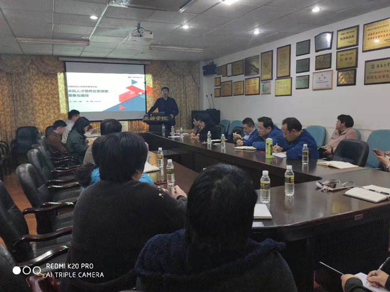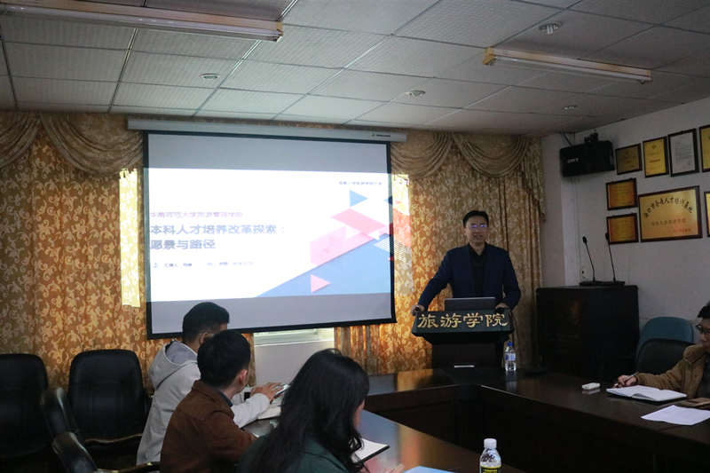 为了旅游学科本科人才培养方案修编,完善学院人才培养方案修订,12月3日下午,学院邀请了华南师范大学旅游管理学院院长刘俊教授莅临我院指导工作,与我院师生开展了学术交流活动。学术交流活动在8-205会议室召开,由侯佩旭副院长主持,郭强院长、何彪副院长、谢祥项副院长、各系主任及部分老师和研究生参加了活动。