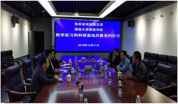 为促进旅游学院与海南省规划展览馆之间的交流与合作,为学生提供校外实习实践基地,同时也为海南省规划展览馆更好地发挥综合性展馆作用,2019年12月17日上午,双方在海南省规划展览馆二楼会议室,签定教学实习和科研实践基地协议。