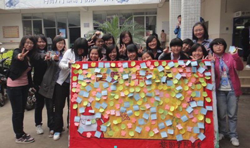 此次活动的主要内容是收集各位同学的圣诞寄语及新年祝福并展示在公示的板报上。现场同学们的热情很高,很快便制作好了一整块寄语板报,满满的贴纸昭示着此次活动的圆满成功。此板报在旅游学院食堂前展示,并在旁边备有贴纸、笔等以便大家继续留言、许愿。