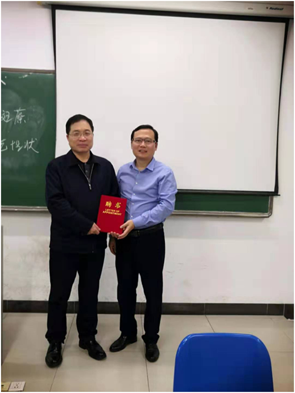 韩力光副书记(主持党委工作)为陈卫东教授(左)颁发冬季小学期授课专家聘任证书