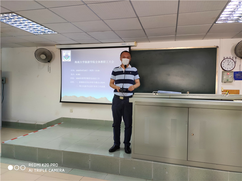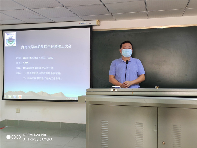 韩力光副书记解读了《海南大学旅游学院2020年春季学期学生返校工作方案》,就复学返校工作老师关心的问题进行了解答。接着,对返校复学工作进行了部署,并指出要将各项工作落细落实到位。他强调,每个部门、每位教职工应各负其责,齐心协力,为学院、为学生做好返校复学服务工作,确保学生有序安全健康返校,并希望教职工及时回应学生的关切,营造良好的舆论氛围。
