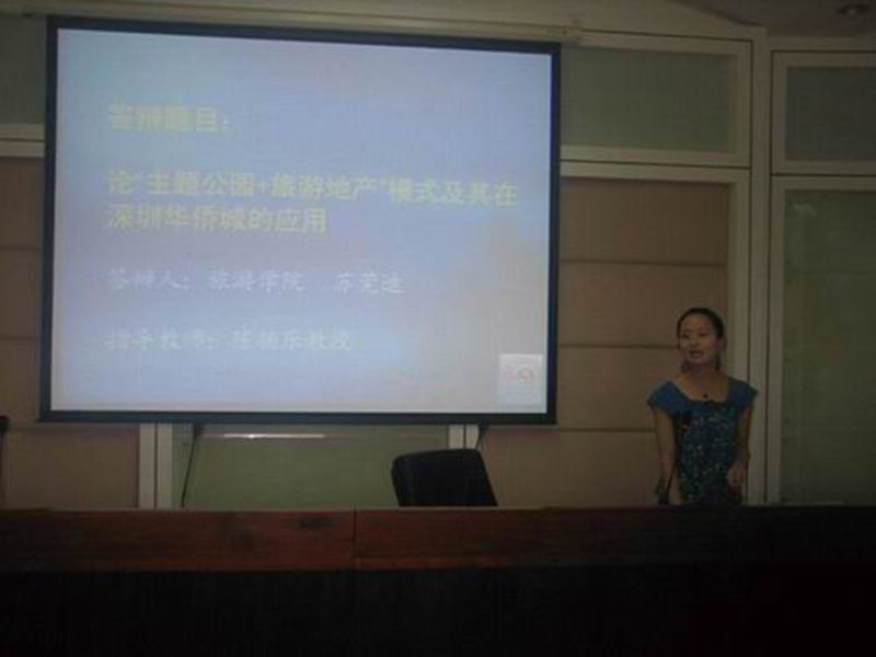苏莞迪同学的答辩论文题目为:“论“主题公园+旅游地产”模式及其在深圳华侨城的应用”。在前人研究的研究基础上,苏莞迪同学通过定性分析和定量研究相结合等研究方法,就主题公园、旅游地产和“主题公园+旅游地产”三个基本概念、主题公园广阔的市场前景、主题公园与旅游地产的互动关系以及“主题公园+旅游地产”经营模式在深圳华侨城的融合等方面深入探讨;论证了“主题公园+旅游地产”经营模式所具有的推广的可行性;同时还从消费者支付能力不足等方面分析了“主题公园+旅游地产”模式发展过程中可能存在的障碍因素并针对主题公园的持续发展,提出了“经营方式要灵活多样,经营组织要创新”等有利于“主题公园+旅游地产”发展规划的建议。苏莞迪同学的论文选题新颖,概念清楚,结合多媒体课件,图表,图文并茂,思路清晰,论述过程中语言清晰流畅。回答答辩组老师提问时,思路敏捷,准备充分。对现场同学提问,应对自如,礼貌谦虚,很好地展现了旅游学院优秀毕业生的风采,给到场观众留下了深刻的印象,赢得了在场师生的高度赞扬!