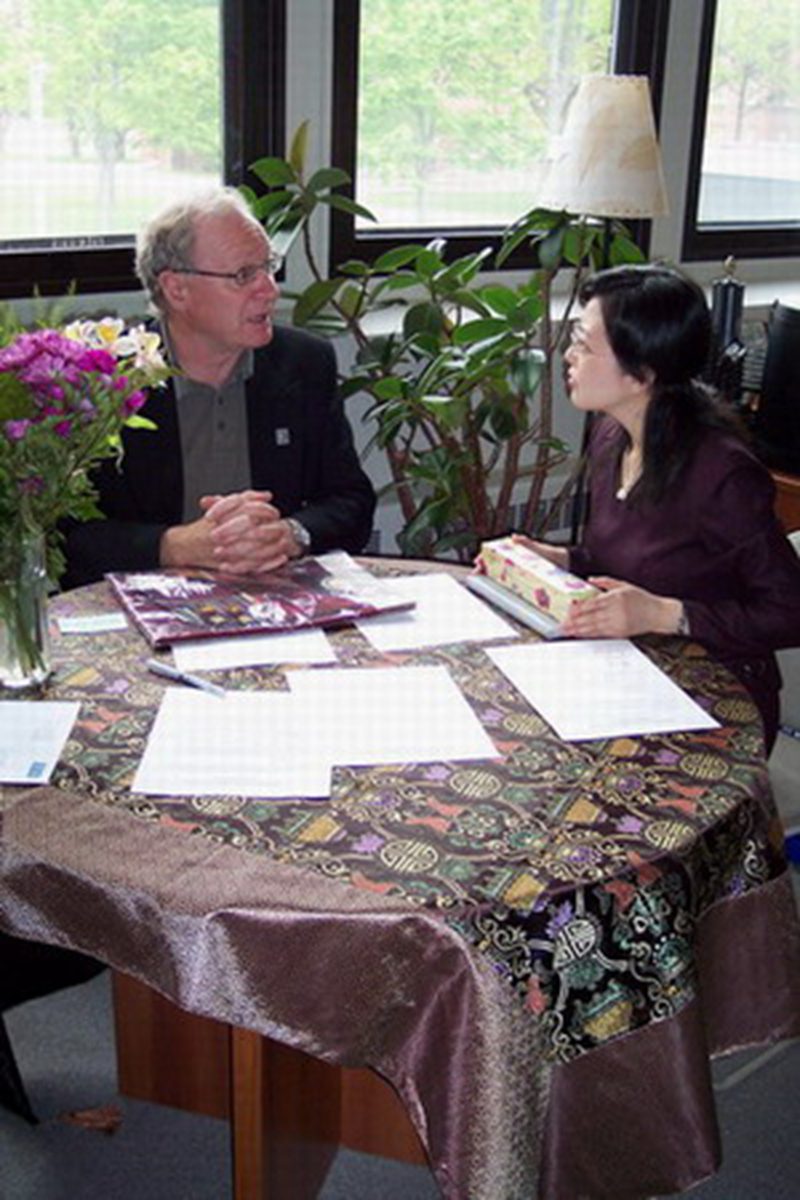 加拿大爱德华王子岛大学韦德校长(左一)与杨红老师亲切会谈