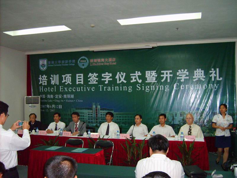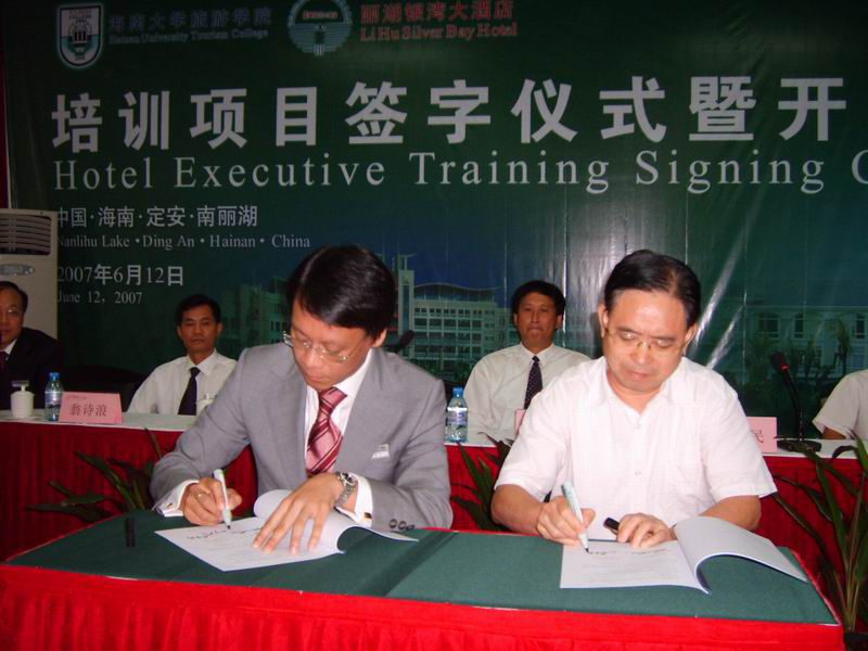 2007年6月12日上午,旅游学院与丽湖银湾大酒店培训签字仪式在定安南丽湖举行。