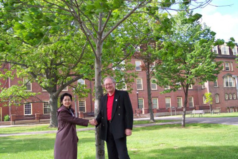 爱德华王子岛大学韦德校长与杨红老师(左)亲切握手