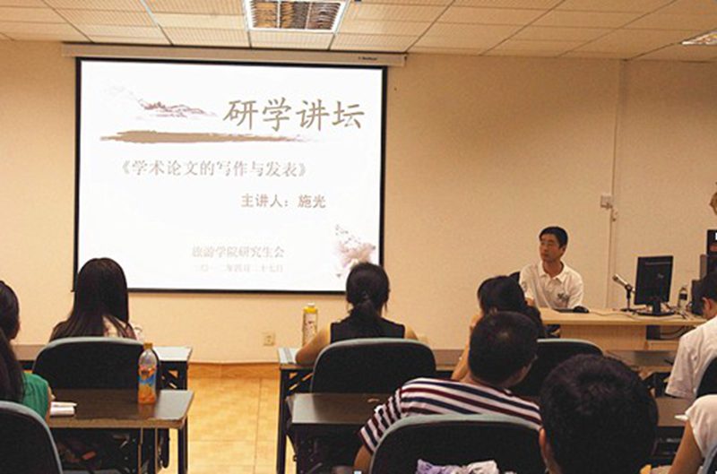 2012年4月27日晚上七点半,由海南大学旅游学院研究生会举办的第一期“研学讲坛”在8教202室顺利进行。本次讲座邀请旅院应外系系主任施光教授主讲,旅院研究生会指导老师陈青老师也亲临现场指导,同时还有来自各个学院的研究生以及本科生到场聆听,现场气氛热烈,讨论激烈。
