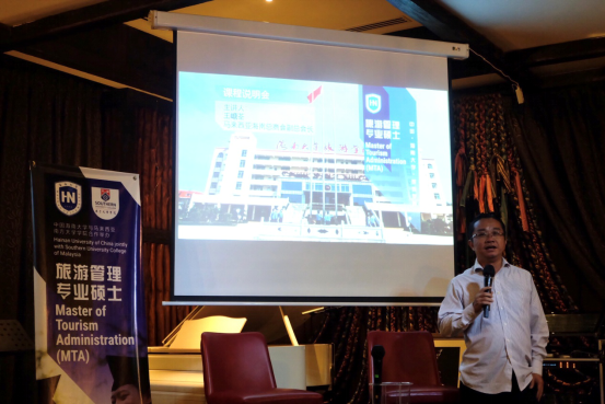 王嵣荃先生首先代表海南大学旅游学院在会上致辞,对与会嘉宾的到来致以最诚挚的感谢,并围绕项目情况做了简短的介绍。王嵣荃先生结合海南自由贸易港、国际旅游消费中心的机遇,分析了海南及海南大学独特的区位优势和政策优势,并深具信心的表示,海南大学发展迅速,将会成为中国最优秀的大学之一,中马MTA项目将会成为中马高等教育合作的一个典范。说明会吸引了不少有意向的报名者,在互动环节,大家纷纷就项目的课程、报名条件等情况进行了咨询。
