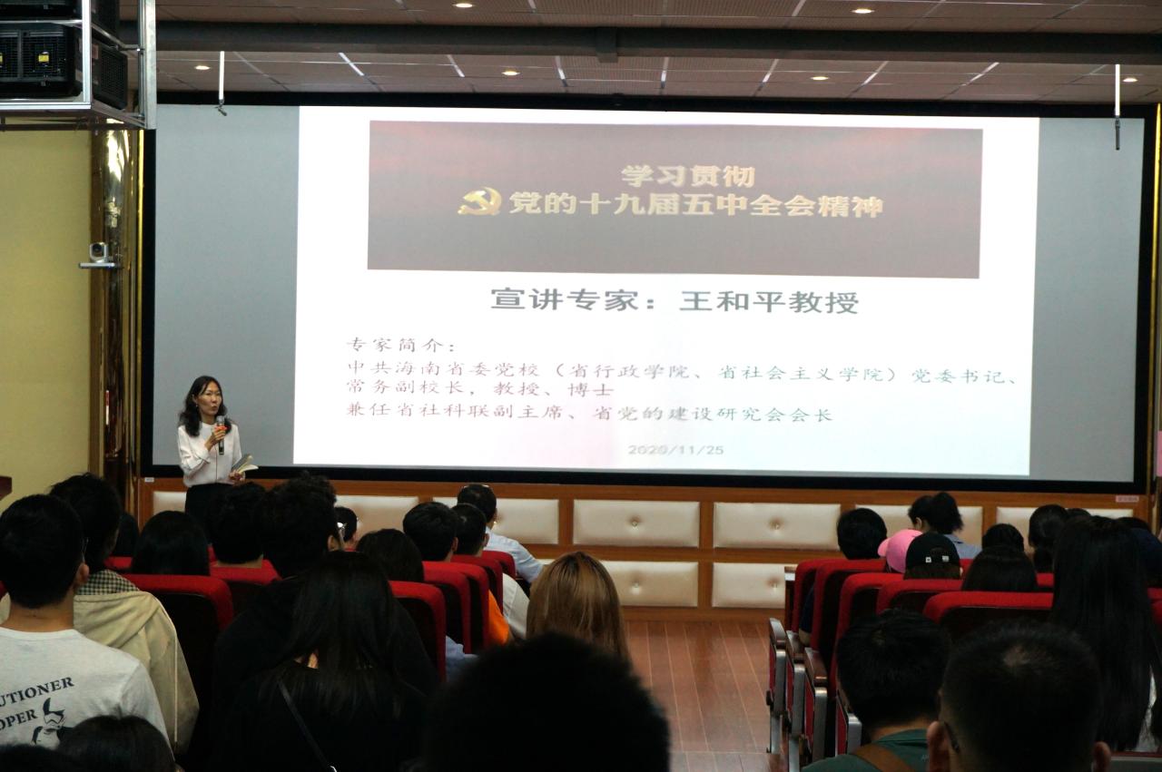 2020年11月25日,应海南大学旅游学院党委诚挚邀请,海南省委党校常务副校长王和平教授应邀在旅院3D实验室进行了十九届五中全会精神的宣讲讲座,近两个小时的宣讲中,王和平教授用82张幻灯片的丰富内容,结合旅游学院的学科特色,为师生党员进行了一场重点突出、专业权威的解读与宣讲。