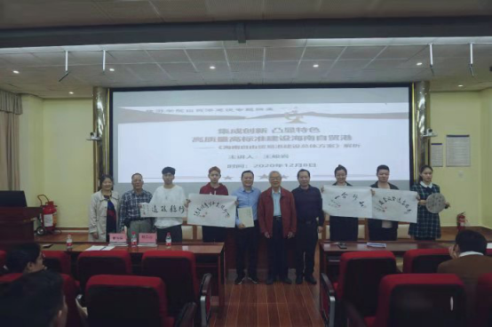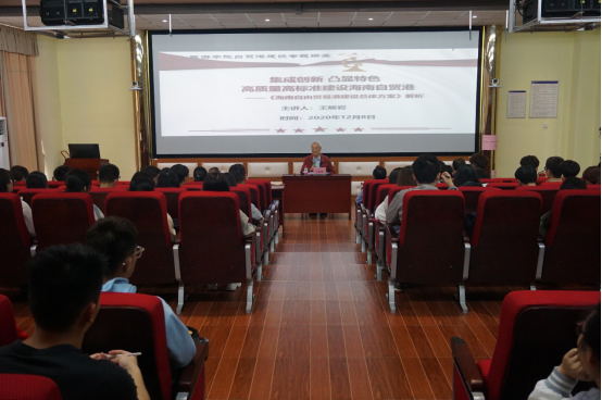 2020年12月8日下午,原海南大学法学院首任院长、国家特贴专家、现校关工委成员退休老教授王峻岩老师应学院邀请,在9教3D报告厅,以“集成创新 凸显特色 高质量高标准建设海南自贸港”为题,为我院百名学生骨干作一场海南自贸港建设政策解读专题讲座。校关工委副主任、原农学院书记杨云山,学院特邀党建组织员、原外国语学院院长曹玲娟教授,校离退休人员服务中心党委书记林少敏,以及旅游学院党委书记韩力光出席讲座。讲座由学院党委组织员、辅导员方琪老师主持。