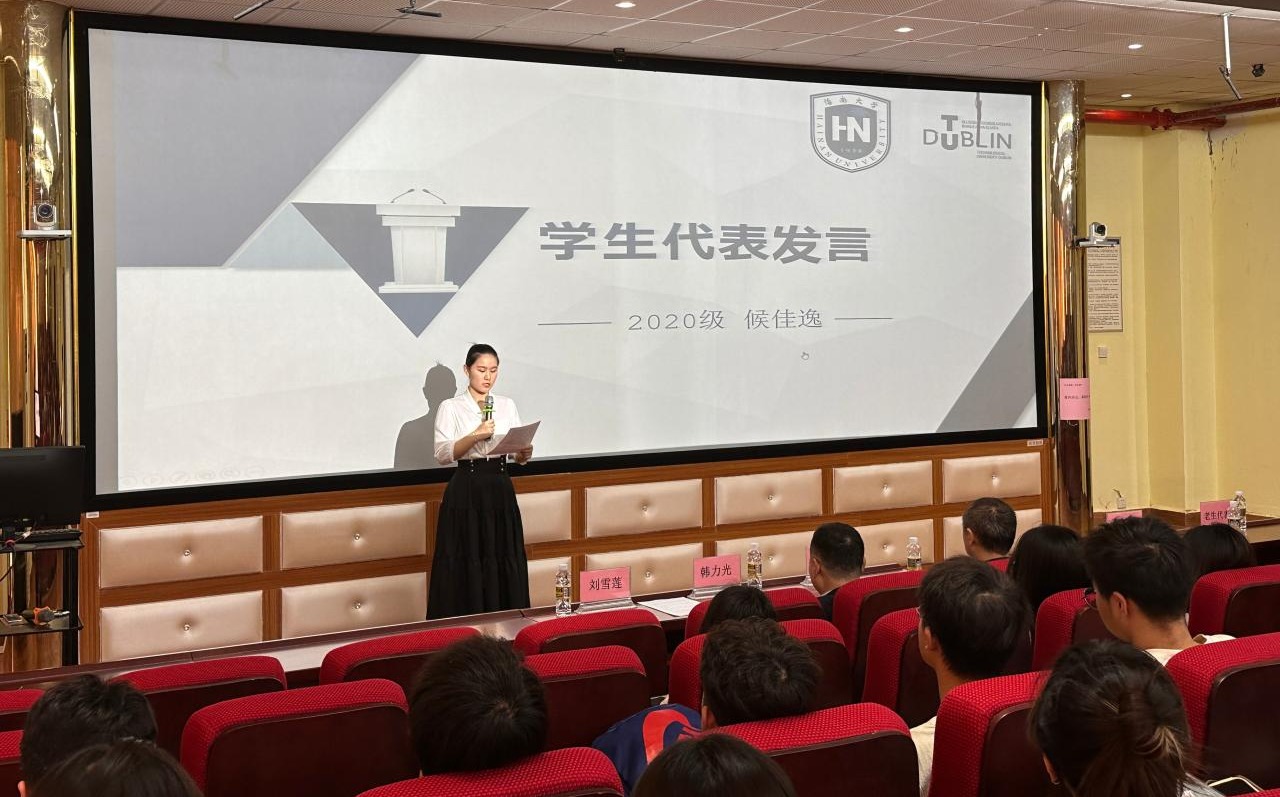 2020级优秀学生代表候佳逸同学分享了她作为学姐的在校学习经验,并对学弟、学妹们给予真诚的祝福与建议。2022级新生代表晏济纯也作为学生代表进行了发言。