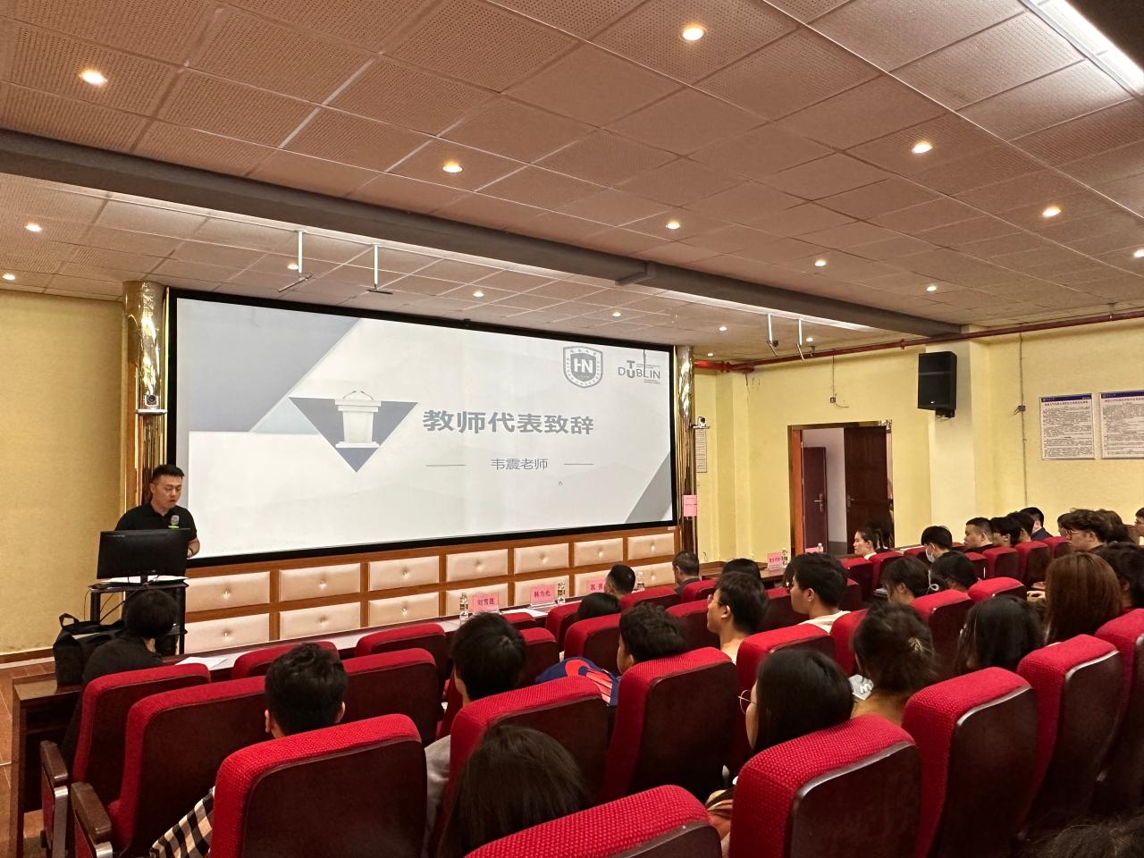 兴趣是最好的老师,教师代表韦震老师结合项目的特点引发学生的求知欲,告诉新生要怎么学、向谁学,从学生及教师的角度出发向新生们传达了“终身学习”的意义,并对新同学们的在校学习提出了建议。