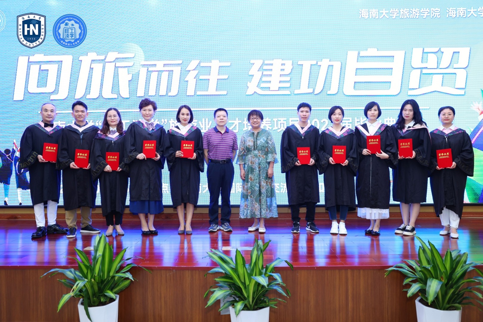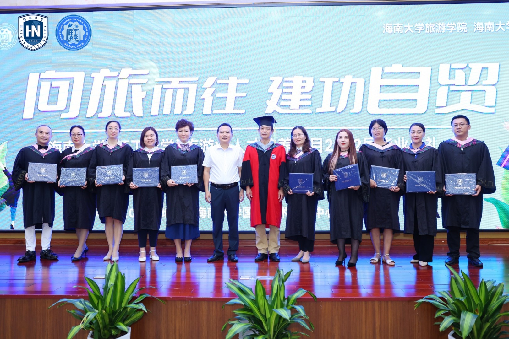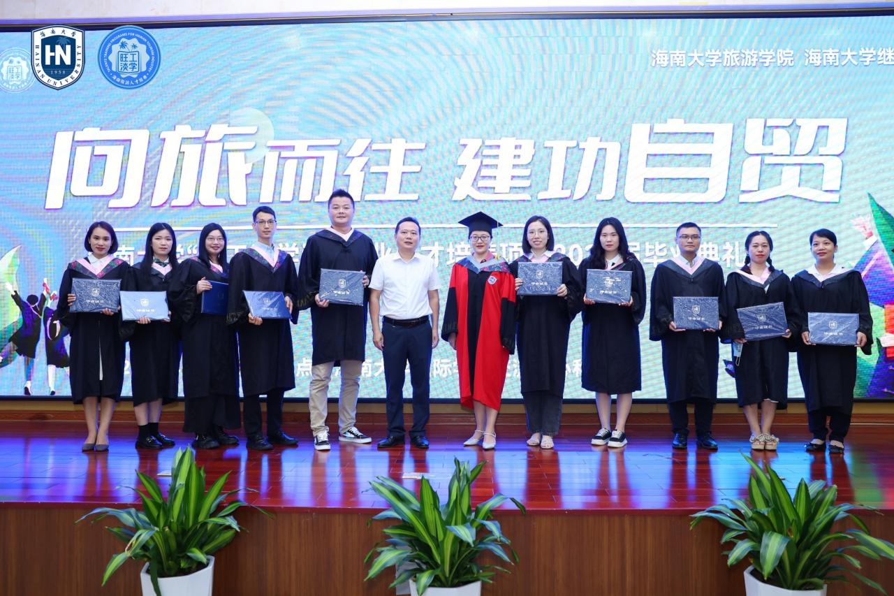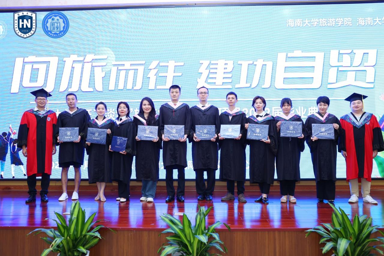 在欢乐的乐曲声中,海南大学旅游学院和继续教育学院的院级领导先后为2022届毕业班的总经理班、海口班、三亚班的毕业生代表颁发了毕业证书。