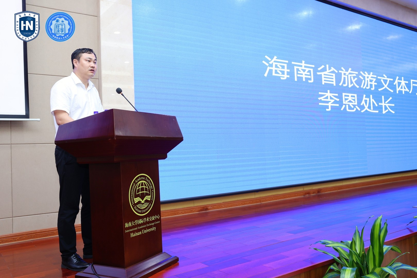 在领导致辞环节,海南省旅游和文化广电体育厅人才教育处李恩处长首先致辞,他对首届毕业生表达了祝贺与祝福,回顾了“旺工淡学”项目从创办到目前的发展过程和持续创新的亮点,介绍了自2019年7月启动以来,累计有15811名旅游业从业人员被录取参加项目学习。生源从最开始的酒店业拓展到2020年的旅游景区、旅行社和旅游餐饮,今年又拓展到了免税购物、旅游商品与装备、高尔夫、乡村旅游等涉旅行业。他表示,“旺工淡学”旅游业人才培养模式在2020年4月被海南省委深改办列为海南自由贸易港首批制度创新案例对外发布。同时,该项目已得到国家发改委和商务部的认可,并向国办、中办报送推荐,在全国复制推广,尤其是2021年4月份项目作为全省六个优秀案例之一,向中央组织部举办的全国自贸区厅局级领导干部“推进自由贸易试验区建设”培训班学员进行展示和汇报,获得中央组织部、省委组织部、省委深改办和参训学员的一致好评。与此同时,项目得到了沈晓明书记的亲笔批示,获得了2021年度海南省政府创新奖三等奖,在旅游人才发展和职业教育改革创新方面,为全国提供了海南经验。