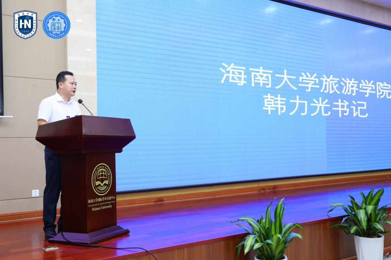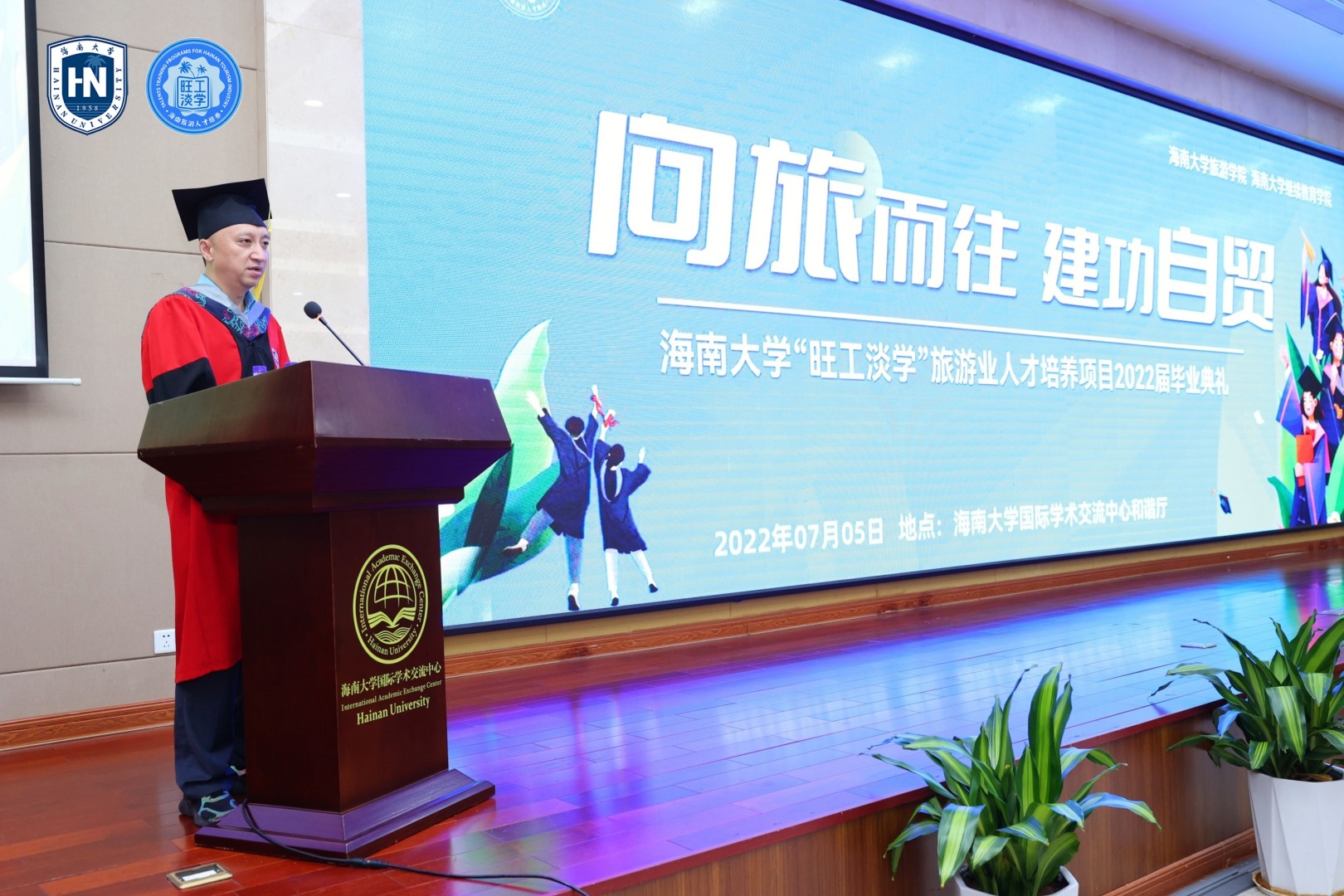 海南大学旅游学院郭强院长以“特别的项目”“特别的学生”“特别的典礼”道出了“旺工淡学”项目的独特价值和深远意义。他回顾了领导“旺工淡学”项目面试考核工作和移动课堂细节,认为有眼光、有行动的首届毕业生要有感恩党和政府的心态,要有创造快乐的能力,要有作为的自贸港旅游人,不断勇攀高峰,为建设具有世界影响力的旅游目的地贡献自己的力量。