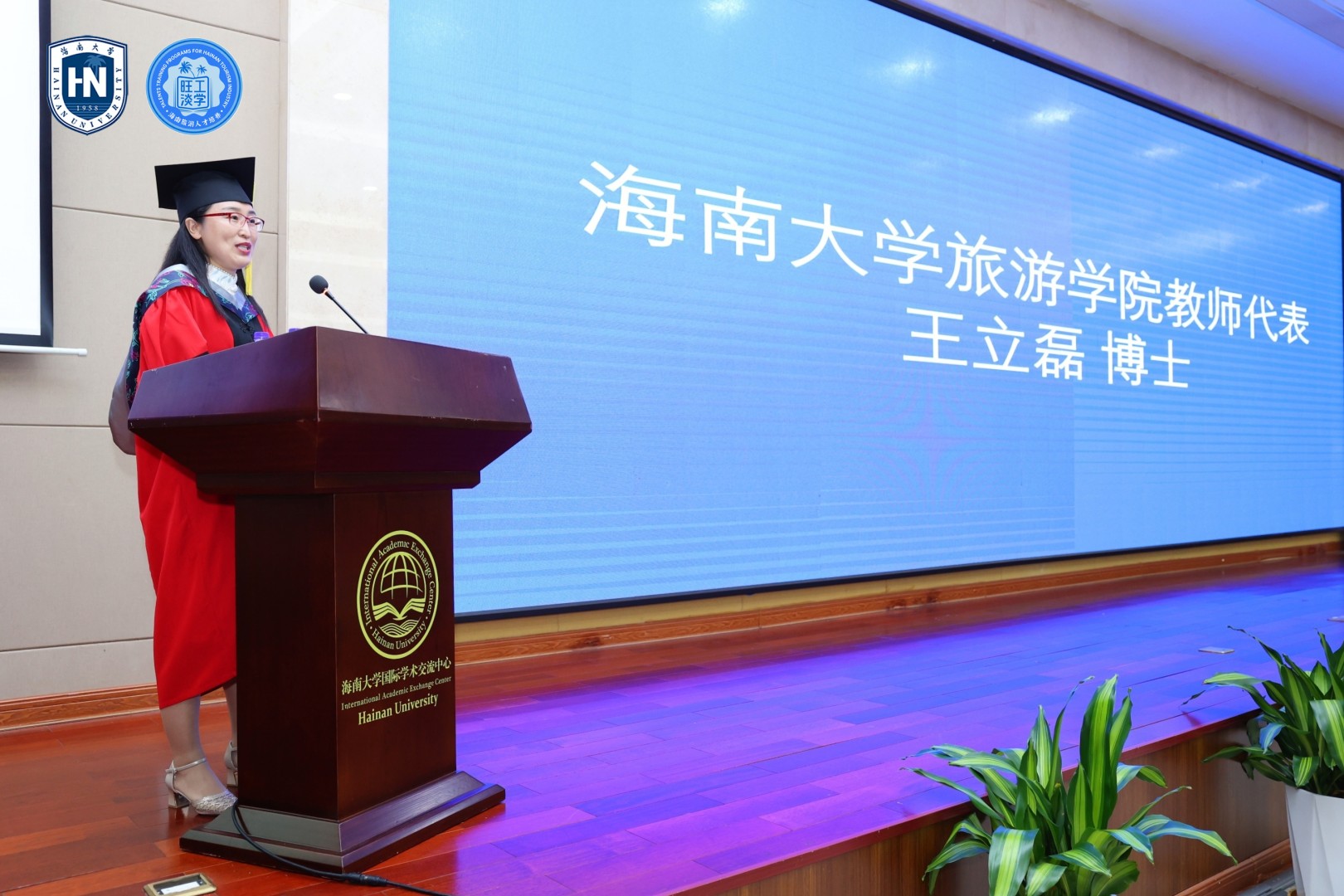 海南大学旅游学院教师代表王立磊博士则回顾了她参与“旺工淡学”项目课程教授过程中“教学相长”的深切感受,充分肯定了首届毕业生一边工作一边学习还要兼顾家庭的坚持和付出,勉励同学们谨遵“海纳百川,大道致远”的海大校训,发挥好海南酒店行业的中坚力量作用,承担起校企合作的桥梁,为培育和输送优质的酒店业人才献言献策,带着自己的热情与学识继续为酒店业的发展奉献力量,为海南自贸港建设增砖添瓦。